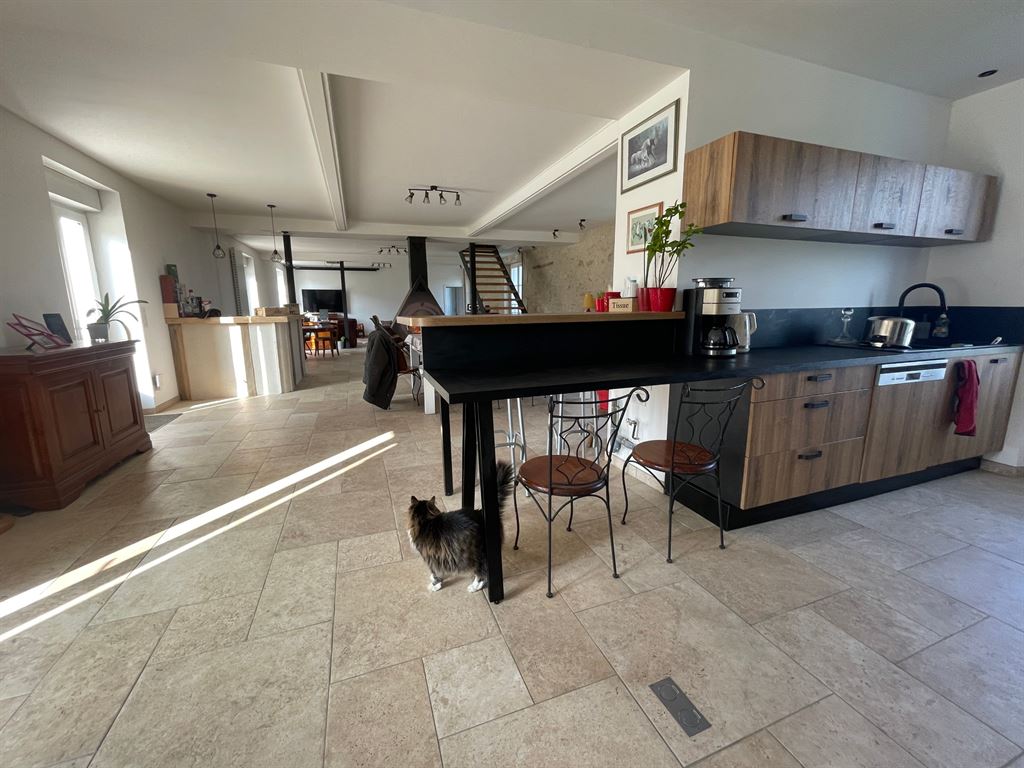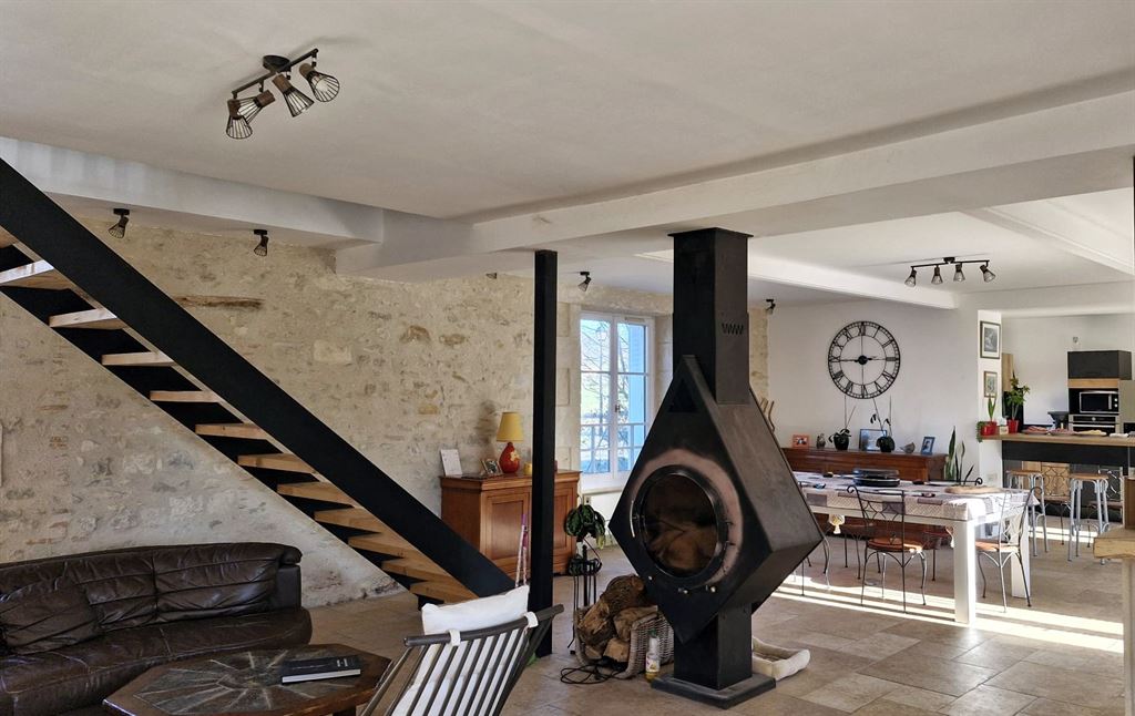 Au rez-de-chaussée : cuisine, salon / salle à manger orné d’un grand poêle à bois s’ouvrent sur la terrasse offrant une vue dominante sur la cour et la campagne environnante.