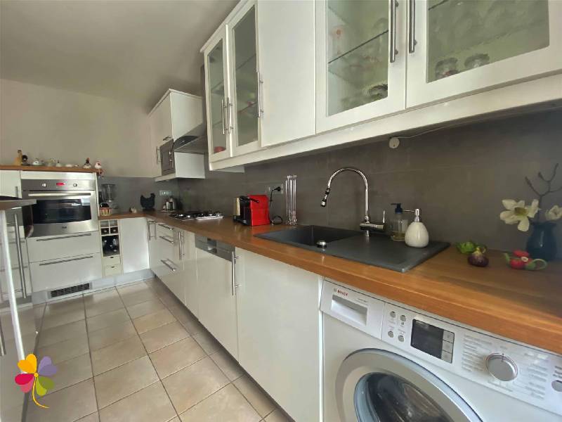 Au rez-de-chaussée, une belle pièce de vie avec espace cuisine aménagée et équipée.