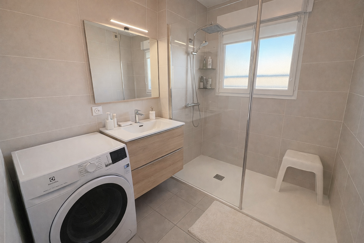 L'espace nuit est distinct et comprend deux chambres avec placards intégrés, une salle de bains moderne avec douche à receveur extra-plat, ainsi que des WC séparés avec lave-mains.