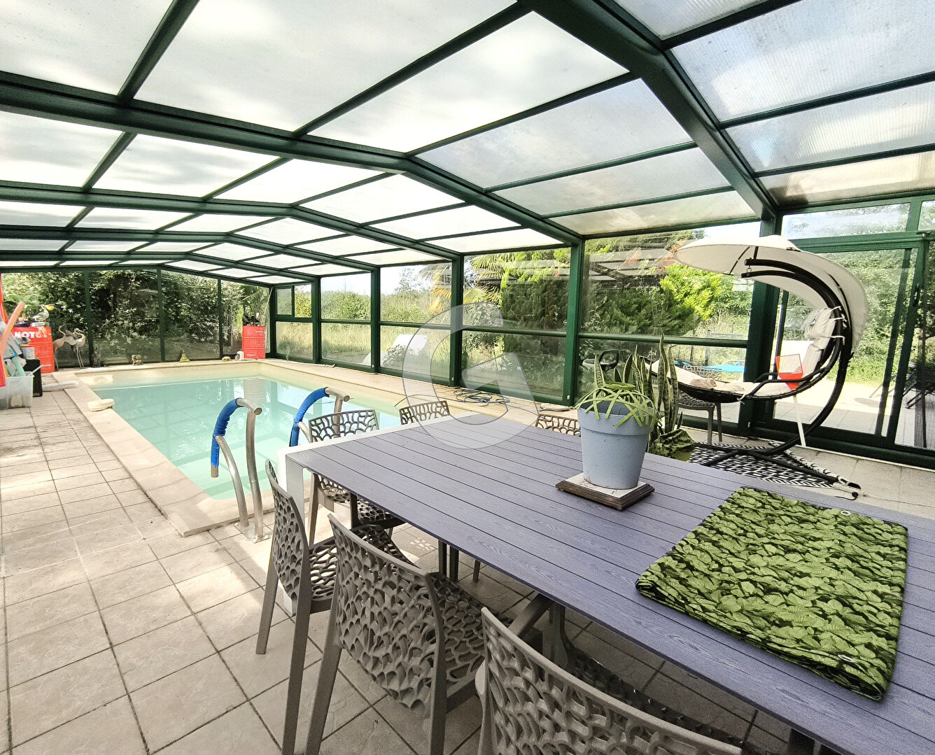En extérieur : garage de 80m², piscine de 8 x 4 couverte par véranda.