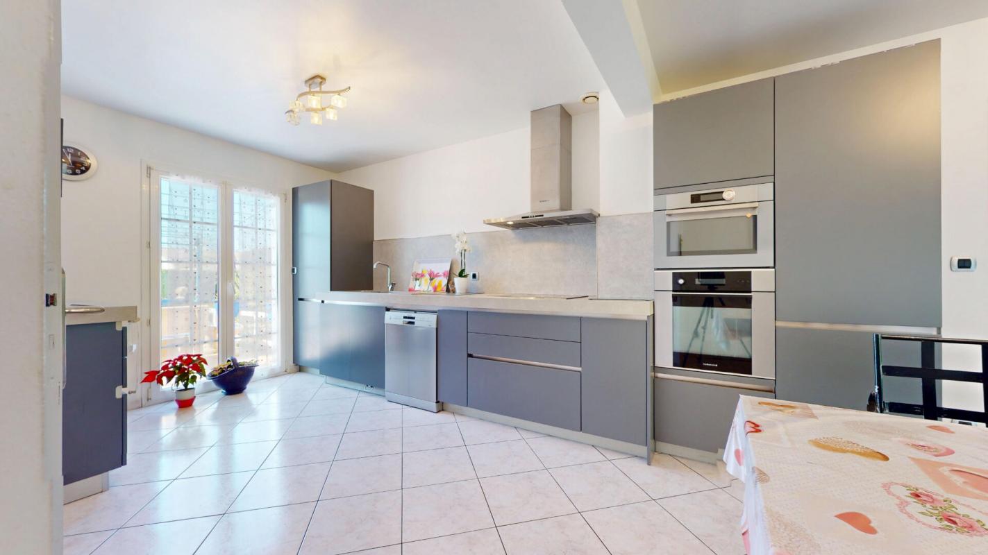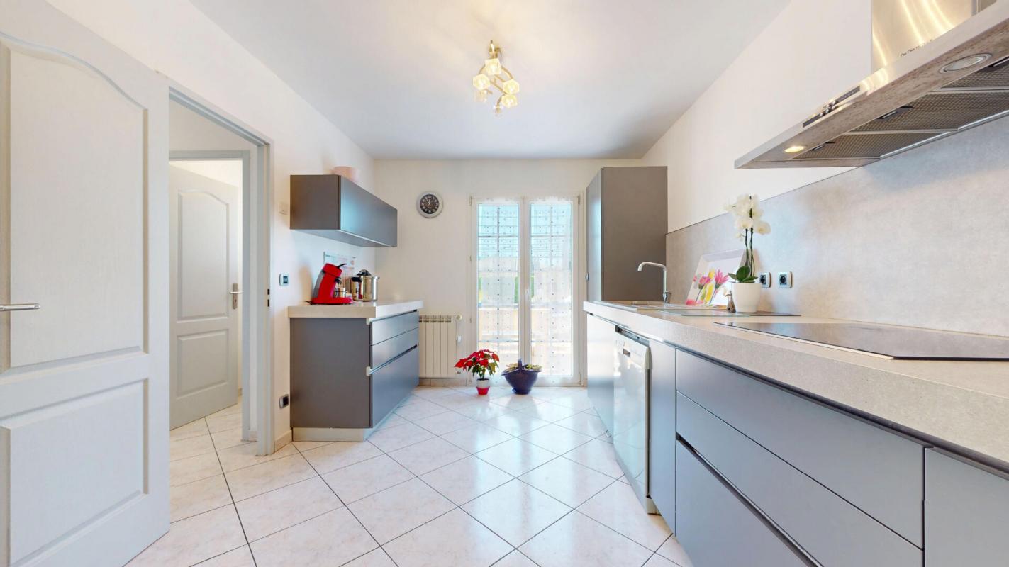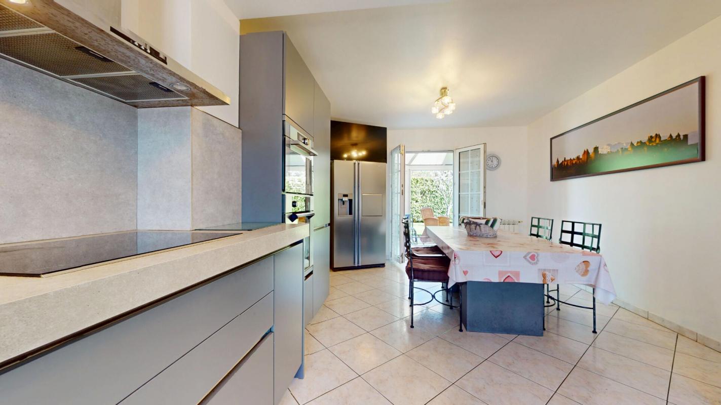 La cuisine, indépendante, est entièrement équipée et aménagée avec goût. Elle donne un accès direct à un grand garage, pratique et fonctionnel.
