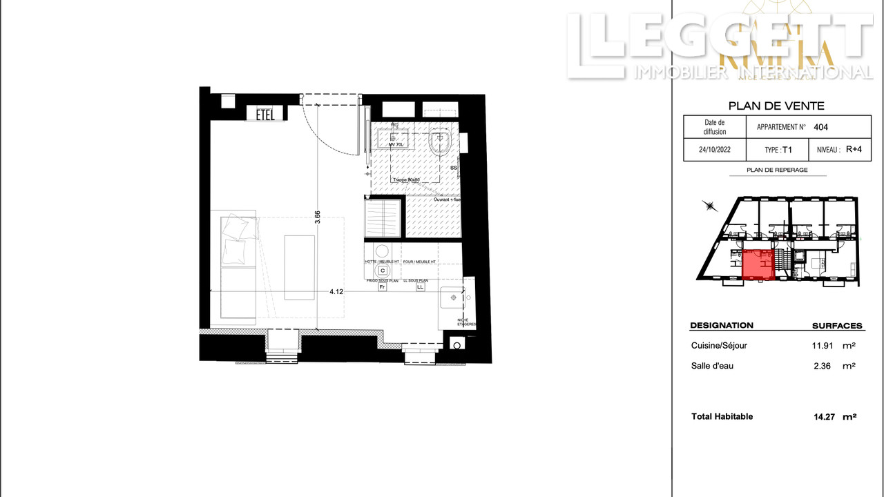 A16453 - Nice Centre - A 100m de la Coulée Verte, proche Vieux Nice et Plages. Complète réhabilitation d'un Palais Belle Epoque. Au 1er étage, avec ascenseur, d'une surface de 18m2 habitable, un appartement studio : entrée, pièce à vivre, cuisine équipée, salle de douche, wc, rangements. Parfait pour pied à terre ou investissement locatif.