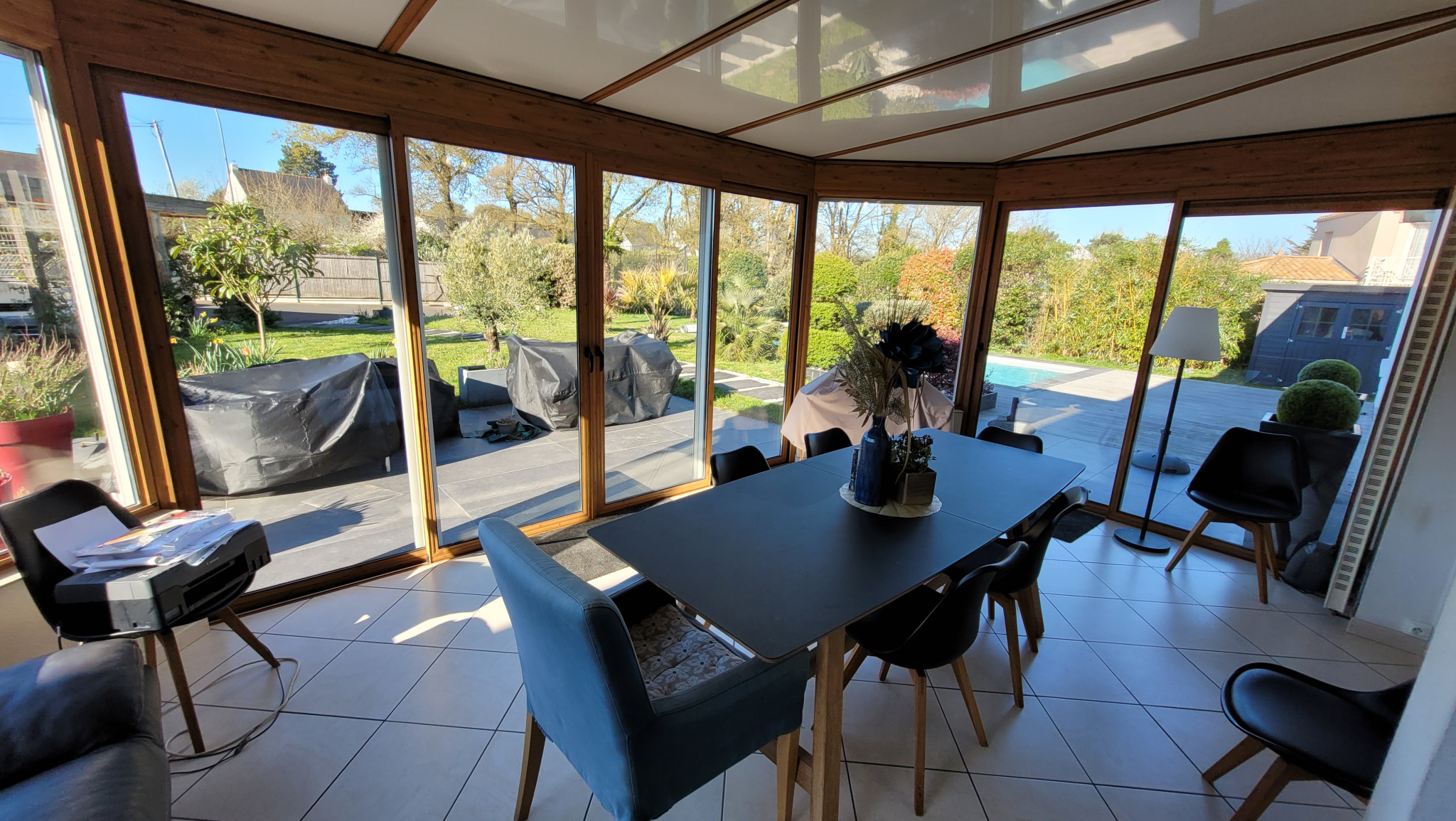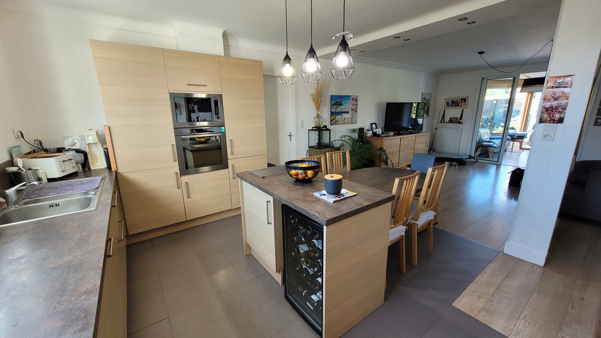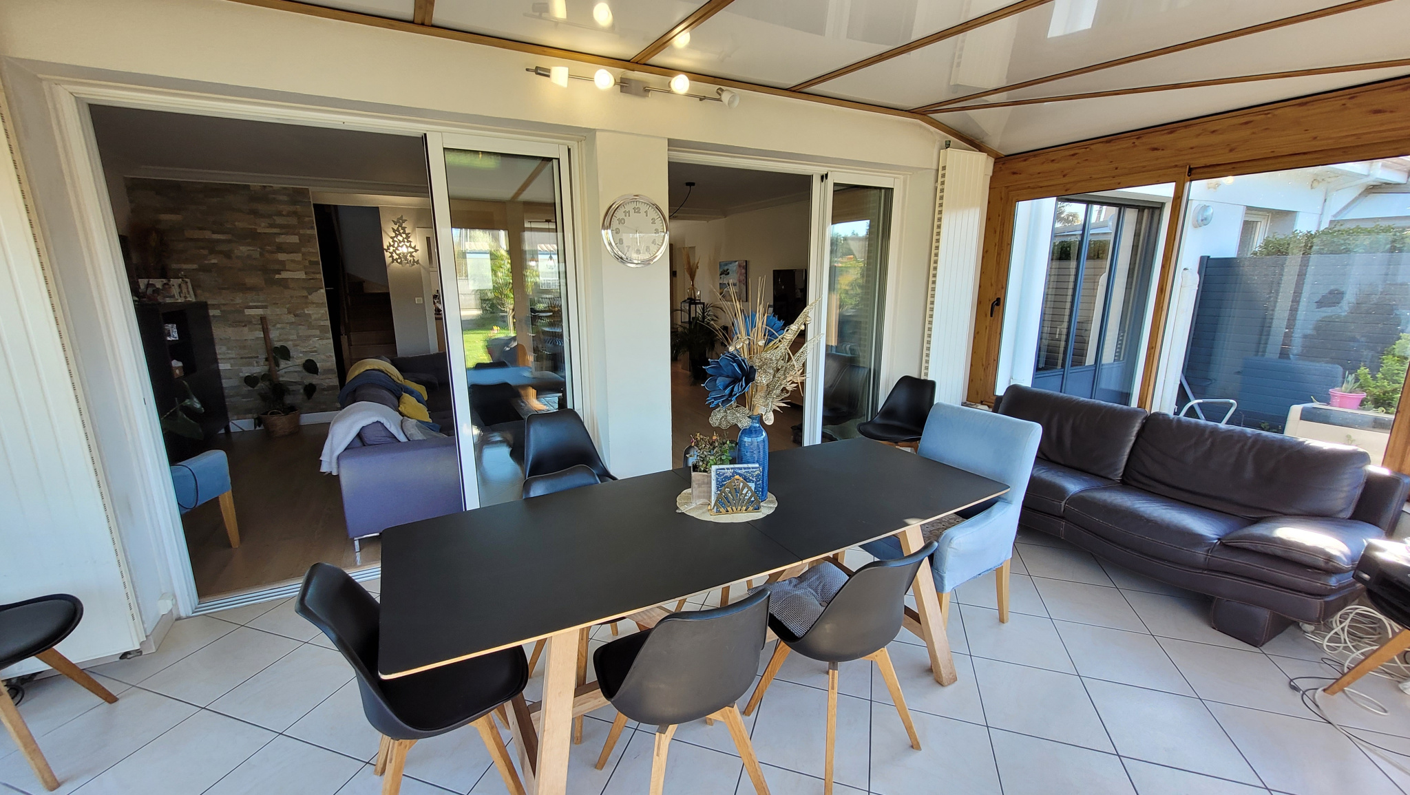 Je vous propose sur VERTOU cette vaste maison FAMILIALE, lumineuse de 225m2 comprenant au RDC une entrée, un beau salon séjour, avec une cuisine ouverte aménagée et équipée,une véranda chauffée et isolée servant actuellement d'espace repas avec vue sur la piscine, 4 grandes chambres (avec placards), une salle de bains, un atelier et une buanderie chaufferie, un WC indépendant.
