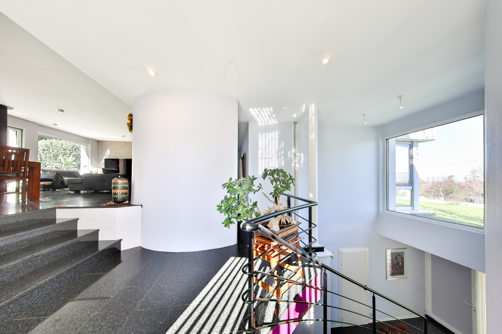 À l'étage, un grand dégagement avec accès à l'ascenseur mène à un superbe salon-séjour lumineux (chauffage au sol et sols en marbre) avec vue sur le jardin et la piscine. Vous profiterez de la chaleur d'une cheminée centrale, d'une cuisine entièrement équipée avec accès direct à une terrasse couverte. Ce niveau comprend également deux chambres, une salle d'eau et des toilettes séparées.