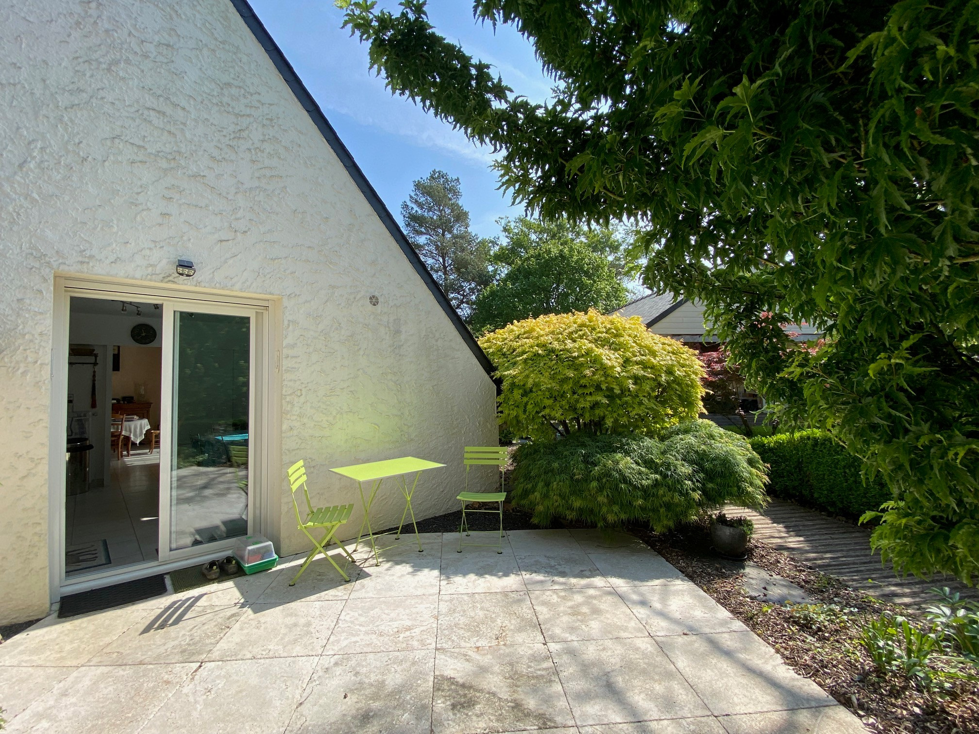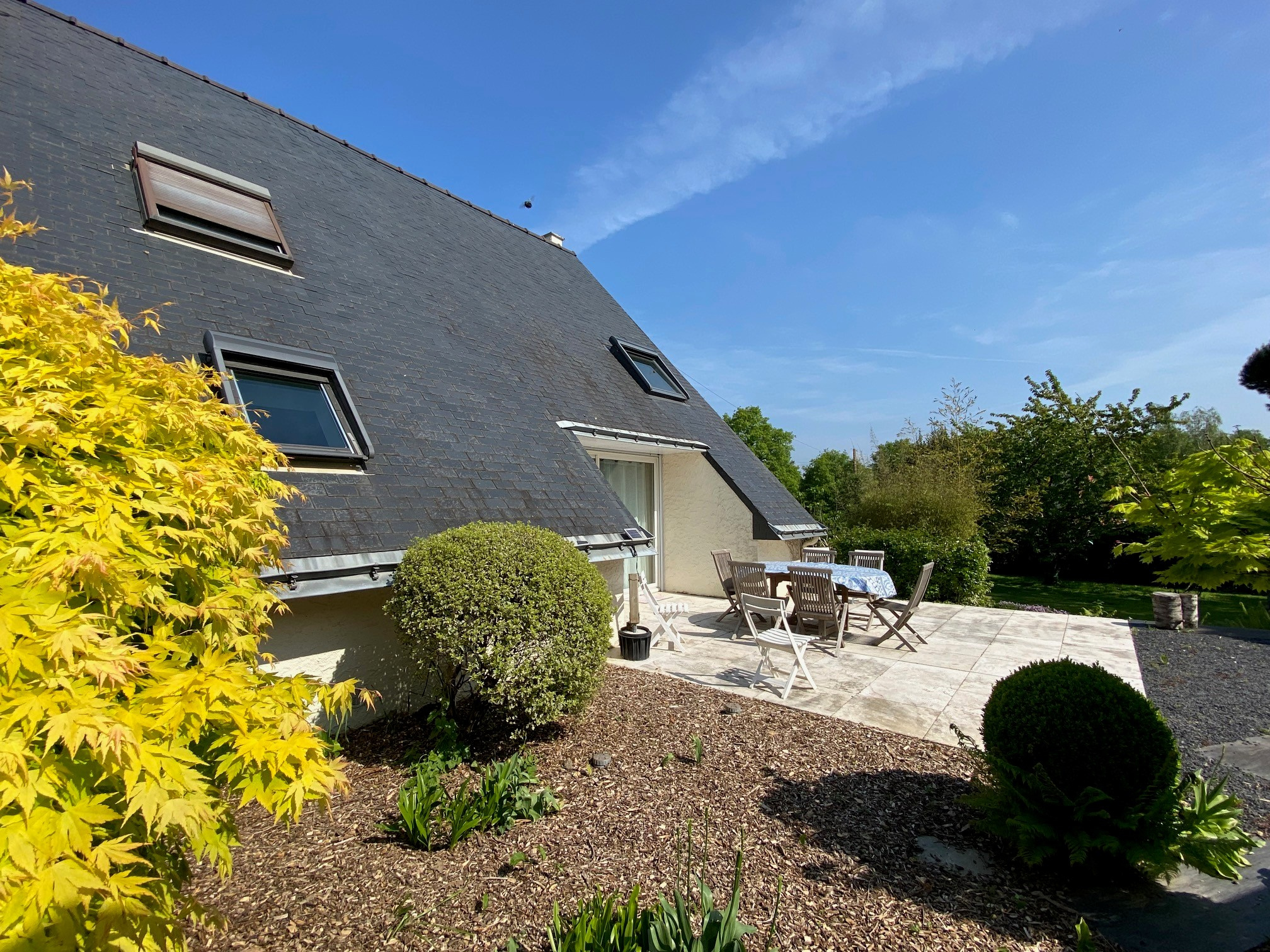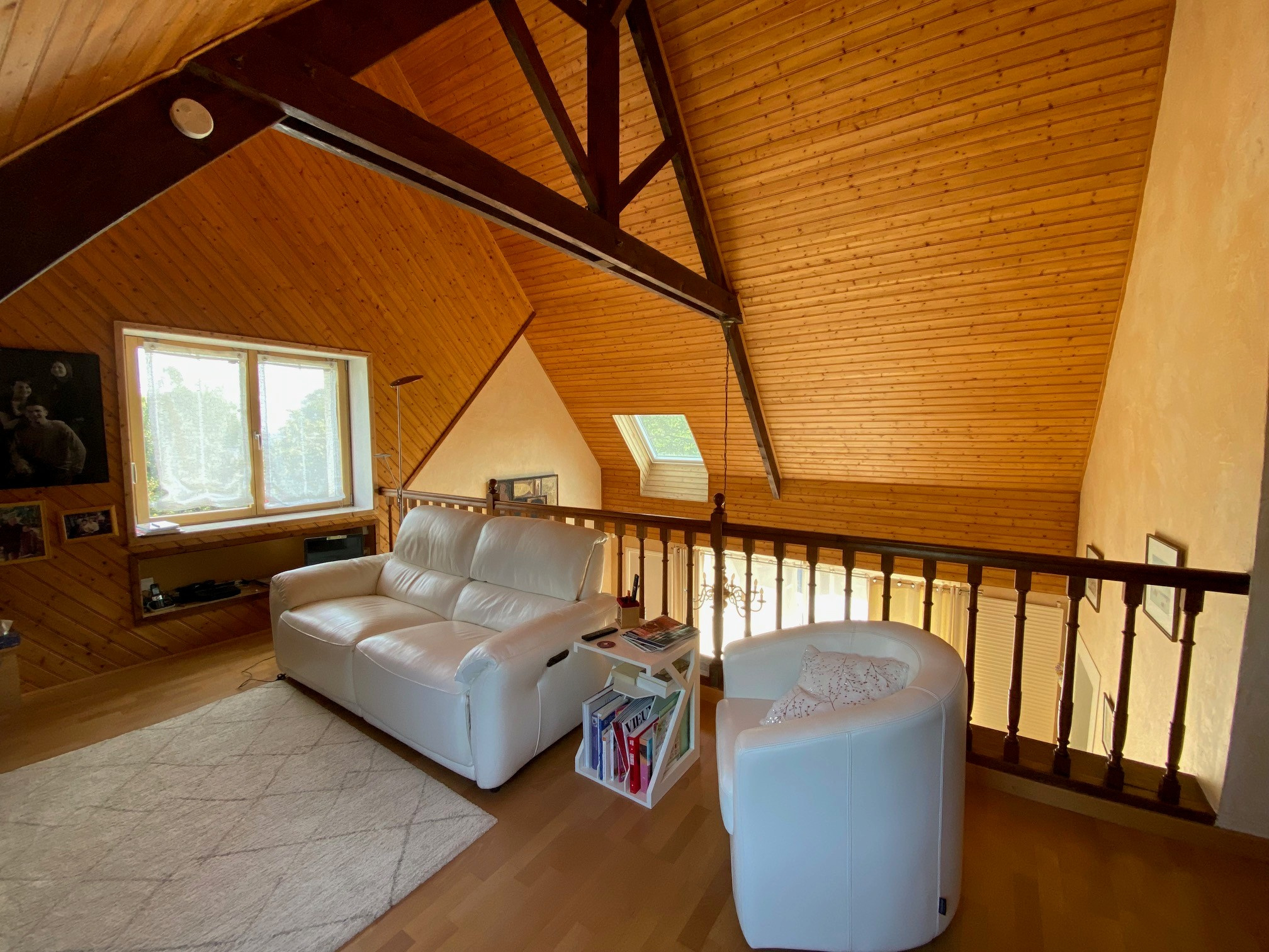 Originale cette contemporaine d'architecte se distingue par ses volumes en demi-niveaux et ses belles hauteurs sous plafonds. L'espace vie se compose d'un séjour salon avec coin feu de 42m2, d'un salon télé ou lecture en mezzanine de 15m2 et d'une spacieuse cuisine de 13m2. La partie nuit est composée de 5 chambres, d'une salle de bains avec baignoire balnéo et douche et d'une salle d'eau privative. Vous trouverez également un garage de 43m2 et une cave en sous sol. Le jardin de 1379m2 entièrement clos et joliment paysager dispose d'un grand préau .
