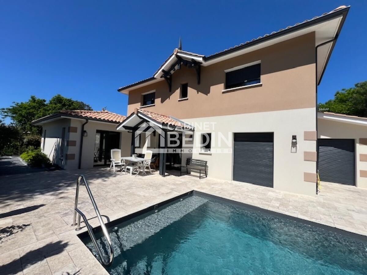 GUJAN-MESTRAS. Nichée dans un quartier résidentiel calme et recherché de Gujan-Mestras, à proximité des commodités, cette magnifique maison de style Arcachonnais construite en 2021 conjugue élégance, confort moderne et qualité de vie. Elle bénéficie de la garantie décennale, d'une assurance dommage-ouvrage, répond à la norme RT 2012 et affiche un excellent DPE en A. Dès l?entrée, laissez-vous séduire par une vaste pièce de vie lumineuse de 55 m² avec belle hauteur sous plafond et poutres apparentes, idéale pour recevoir. La cuisine ouverte, à la fois fonctionnelle et raffinée, s?intègre parfaitement à l?espace de vie. Le rez-de-chaussée offre deux suites parentales, dont une avec dressing, pour un confort absolu au quotidien. À l?étage, deux chambres supplémentaires ainsi qu?une salle de bains complètent ce bien familial et harmonieux. Prestations haut de gamme : climatisation réversible gainable, cellier, garage, matériaux nobles et finitions soignées. À l?extérieur, vous profiterez d?un magnifique jardin paysager avec piscine chauffée exposée plein Sud, bordée d?une superbe terrasse en travertin, dont une partie est couverte pour savourer des moments de détente à l?abri du soleil ou partager des repas conviviaux en toute saison.