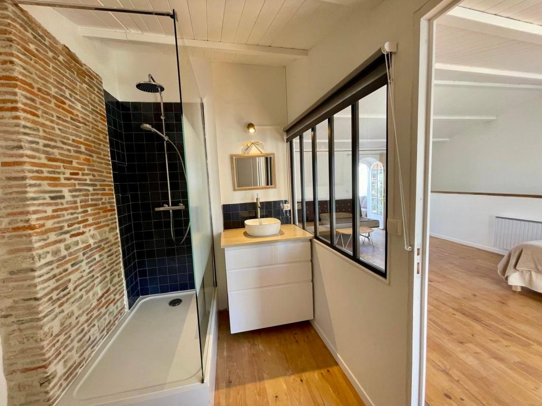 A l'étage une grande chambre, donnant sur une belle terrasse, avec cuisine, une salle d'eau, wc