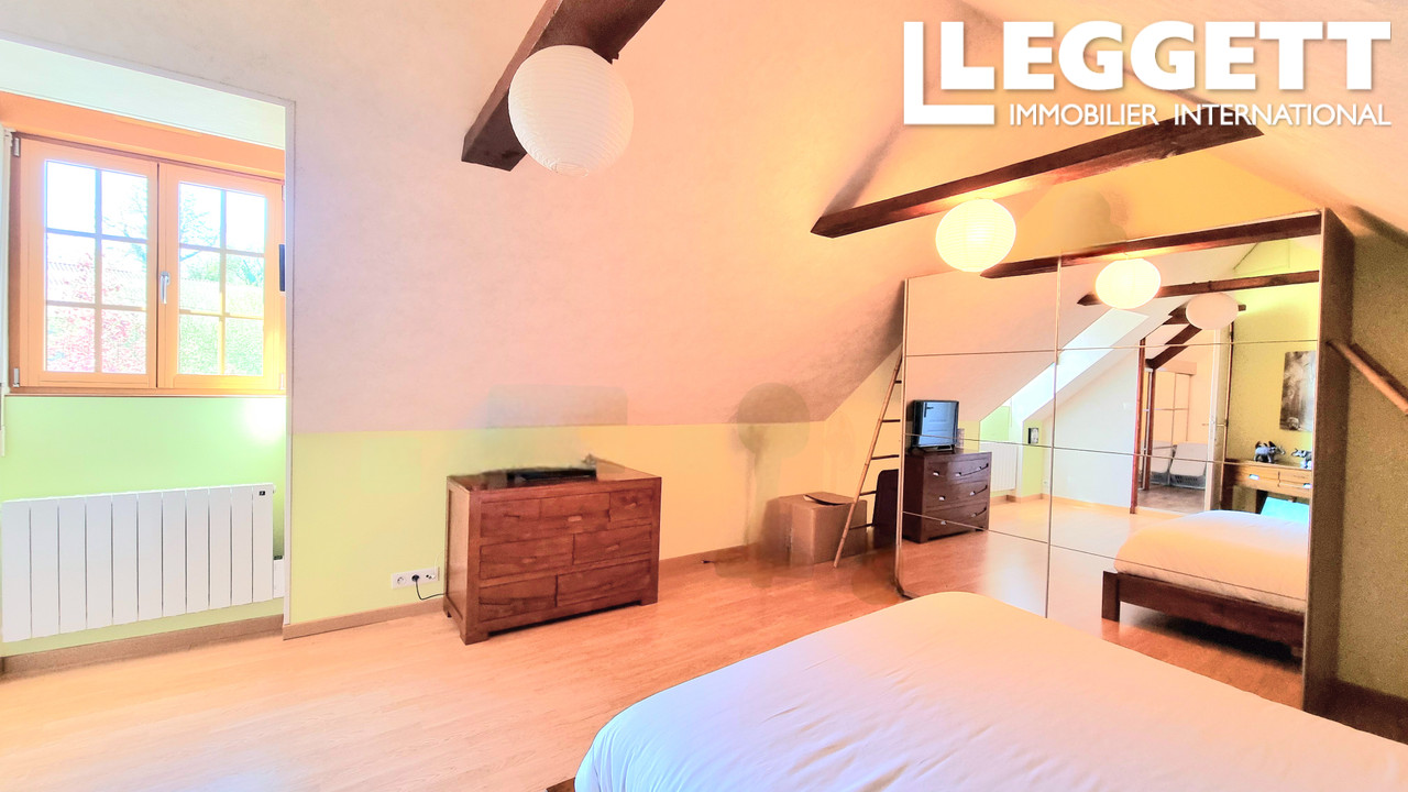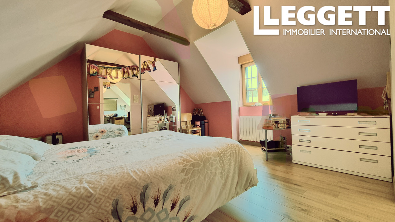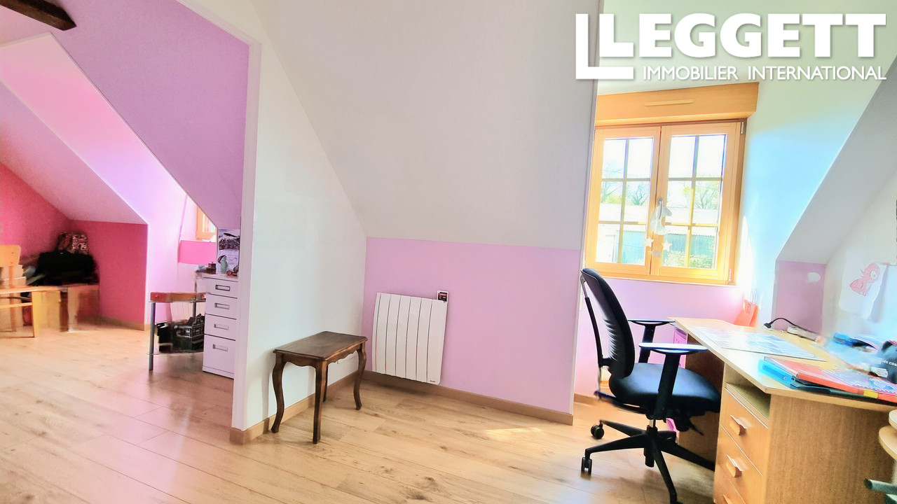 À l'étage : trois grandes chambres, un bureau, une salle de bains avec douche, baignoire, WC et double vasque, ainsi qu'un palier avec de nombreux rangements.