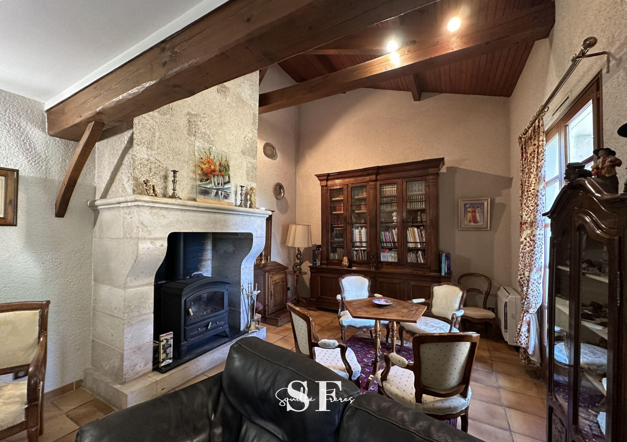 Cette maison se compose en rez de chaussée d'une entrée spacieuse, d'un salon lumineux avec cheminée (28 m2), d'une salle à manger, cuisine équipée séparée et d'un cellier.