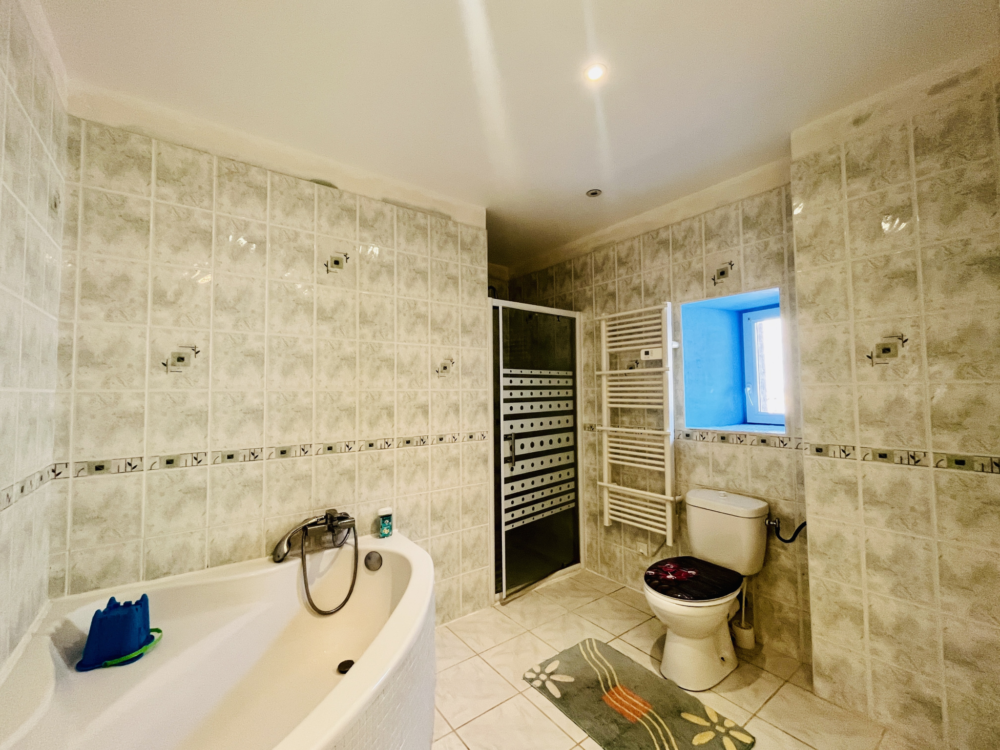 A l'étage, trois grandes chambres avec placards, une salle de bain avec baignoire, douche et toilettes.