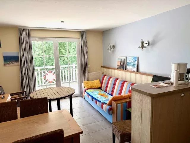 Appartement à Fort-Mahon dans le domaine très calme de Pierre & Vacances, comprenant : une entrée, un séjour avec cuisine donnant accès à une terrasse, une chambre, une salle de bain et un toilette.