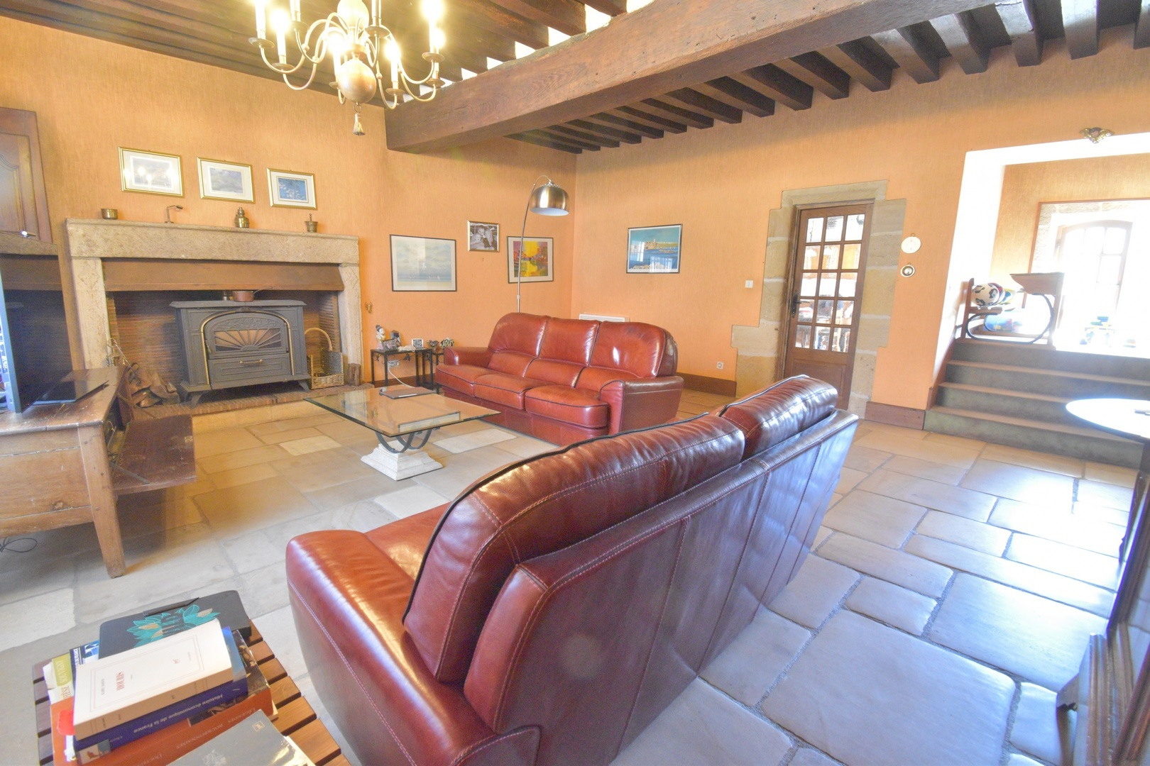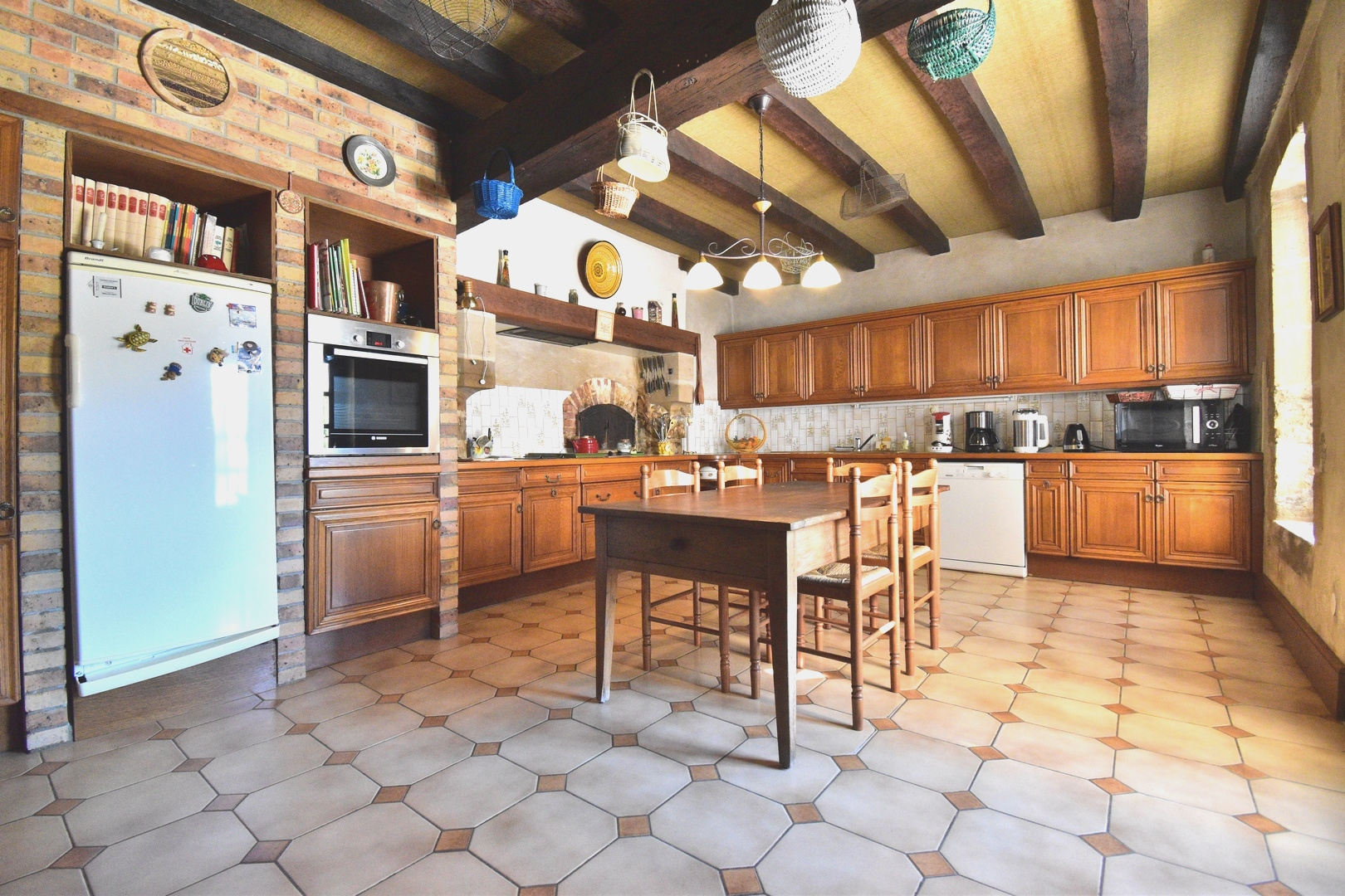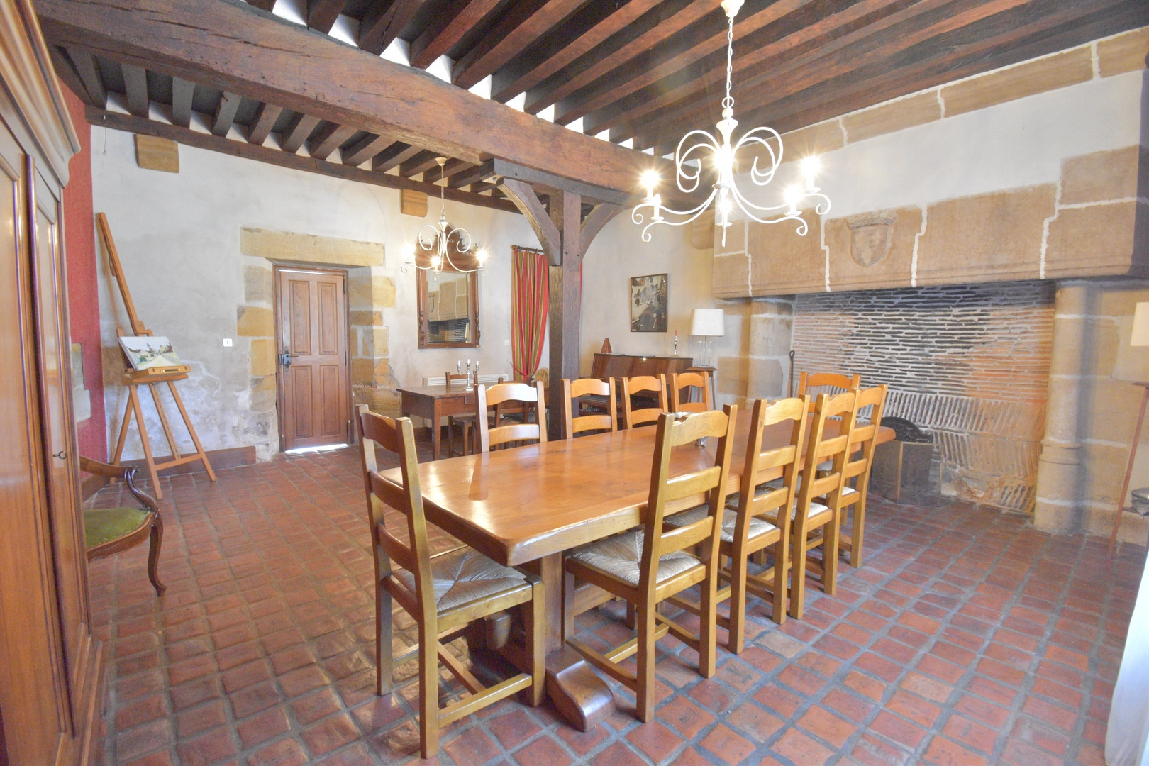 Rez-de-chaussée : une spacieuse entrée, une cuisine avec toujours son ancien four à pain en état de fonctionnement, une salle à manger avec cheminée d'époque, un grand salon avec cheminée, un wc avec lave-mains.