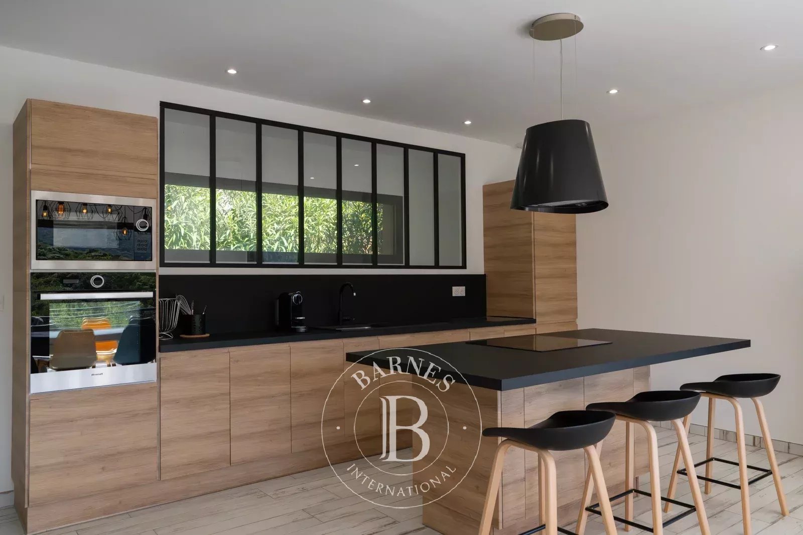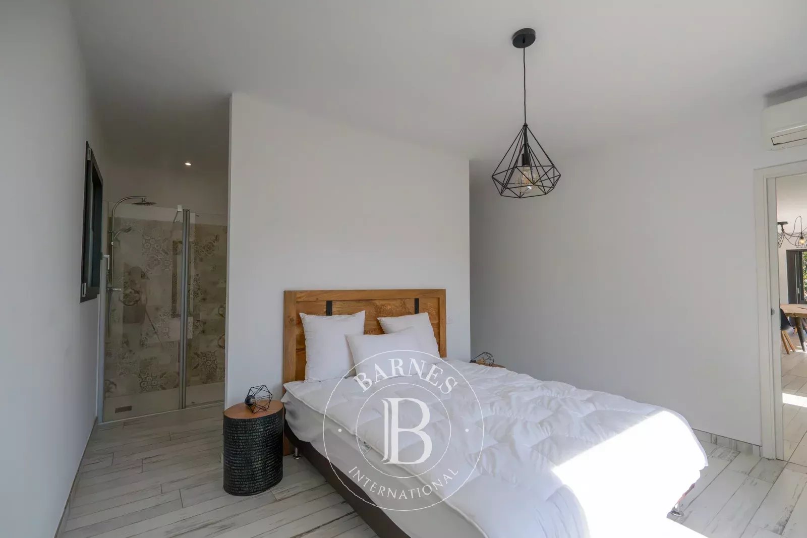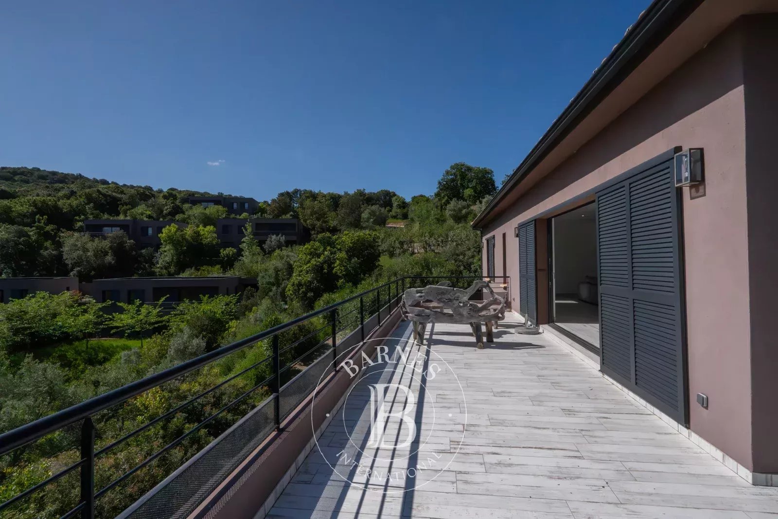 Située dans un secteur résidentiel et calme, au cœur d'un domaine privé et sécurisé à 5 minutes du centre de la station balnéaire et des plages, cette villa d'architecte, d'environ 250 m² utile, sur un terrain en jouissance exclusive de 1200 m², elle propose une entrée accédant à la pièce de vie d'environ 75 m² avec cuisine équipée ouvrant sur une large terrasse avec vue panoramique sur le maquis.