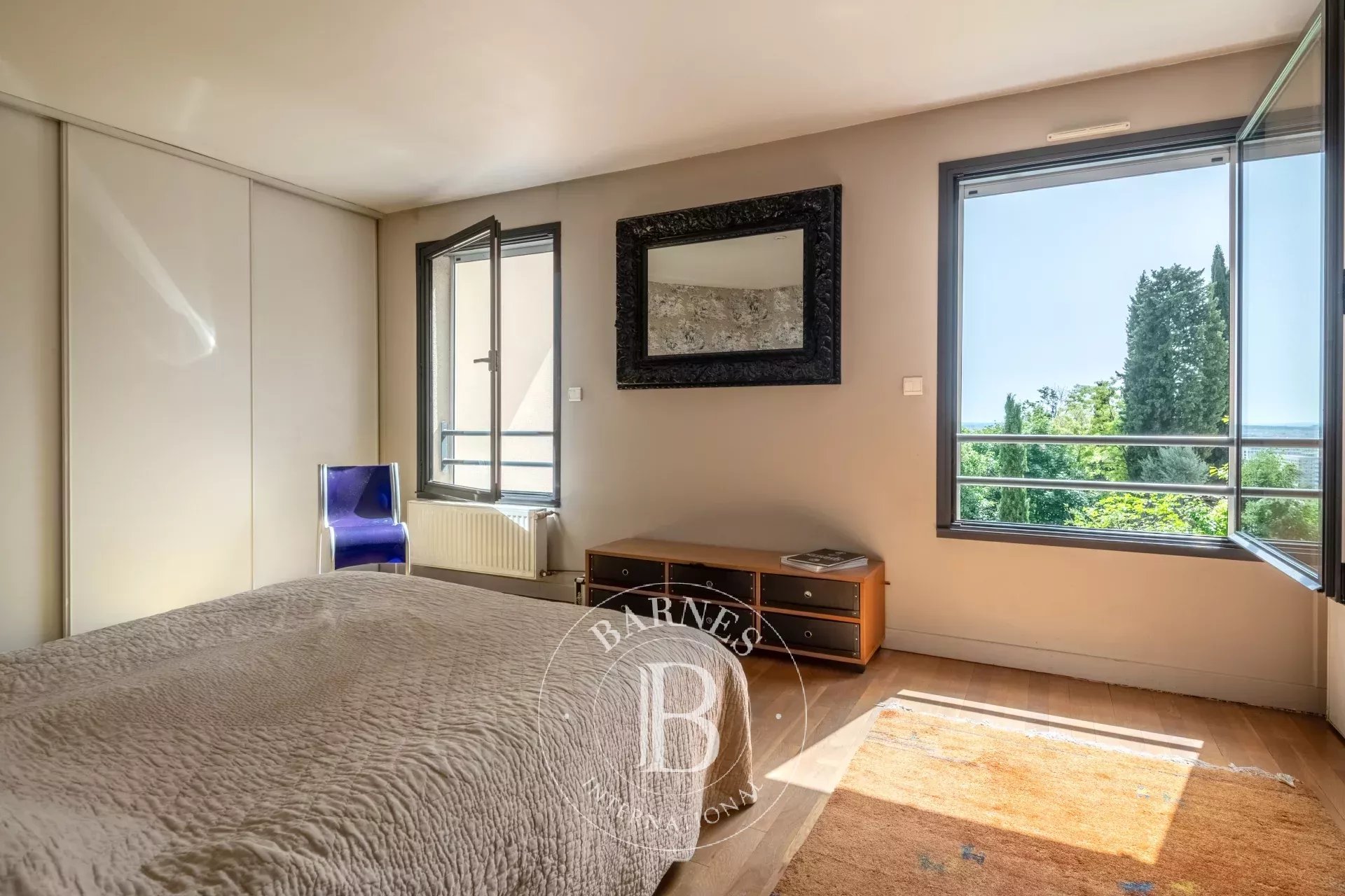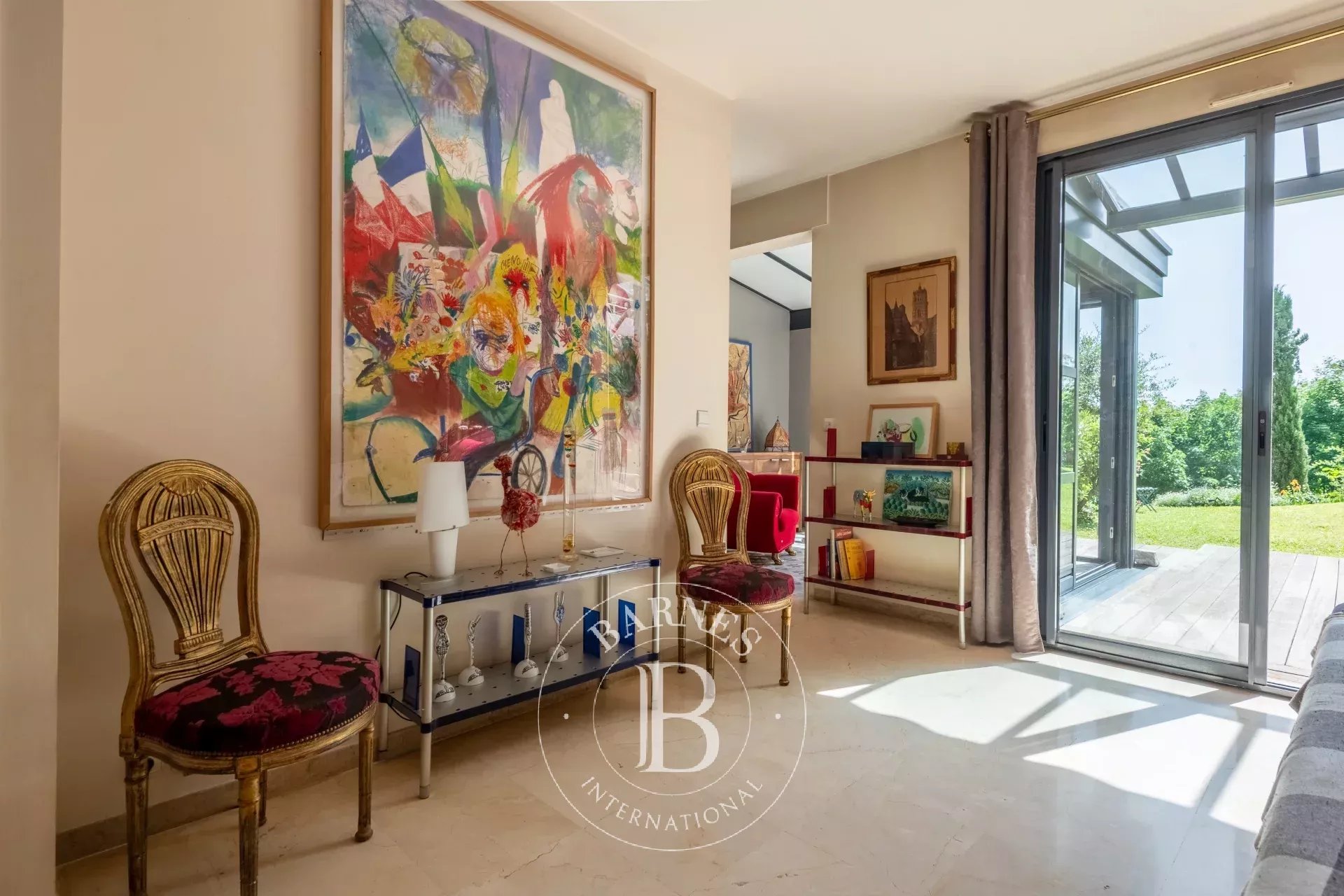 Un agréable jardin fleuri de 220 m² sans vis à vis avec une grande terrasse exposé Est/Sud sur la canopée du parc privé de 7500 m² et de la chaîne des Alpes.