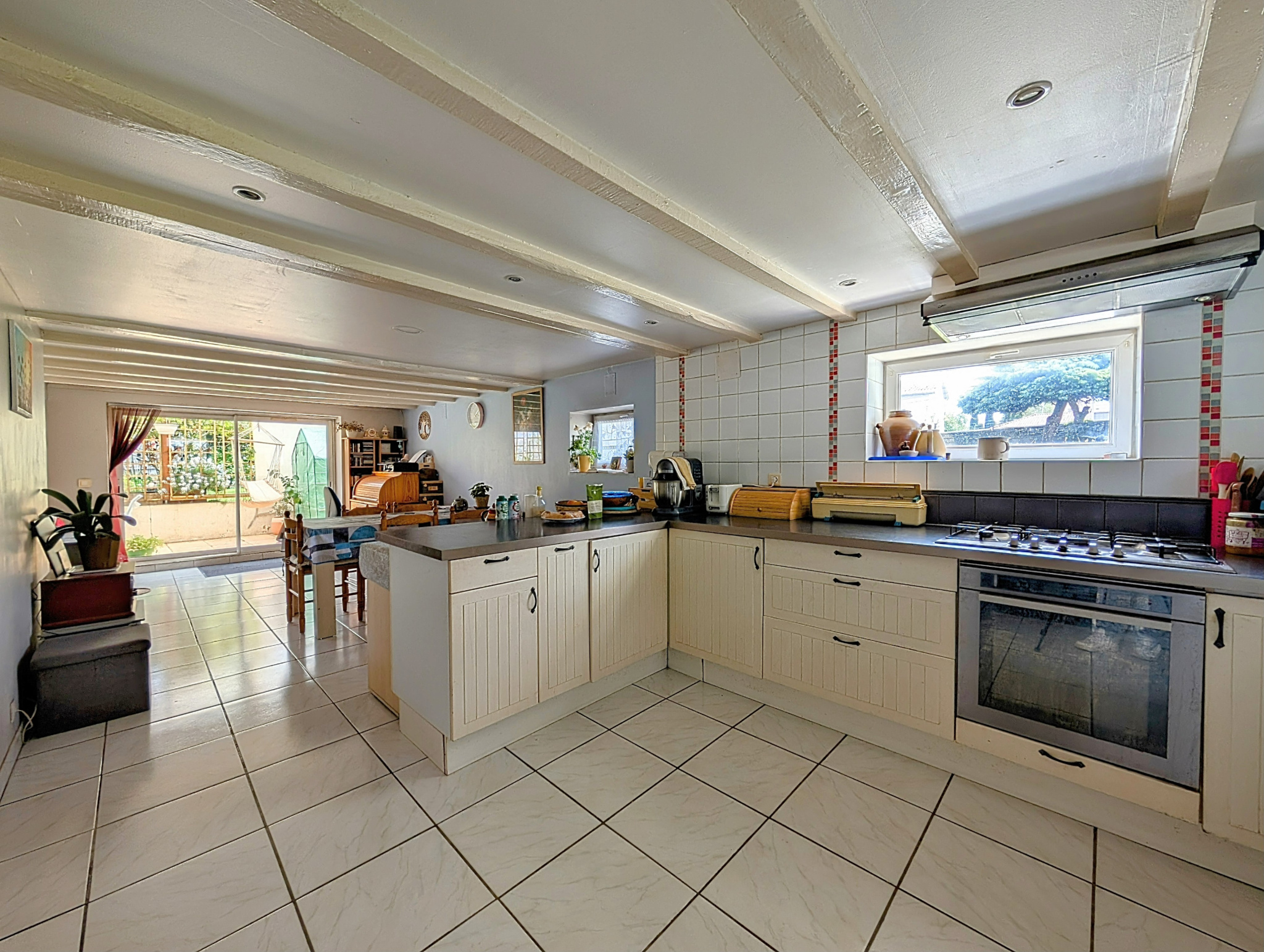 Le rez-de-jardin comprend l'espace de vie où la cuisine américaine est ouverte sur l'espace salon/séjour avec accès direct à l'extérieur et son agréable terrasse couverte. A noter, la présence d'un espace cellier/buanderie attenant à la cuisine.