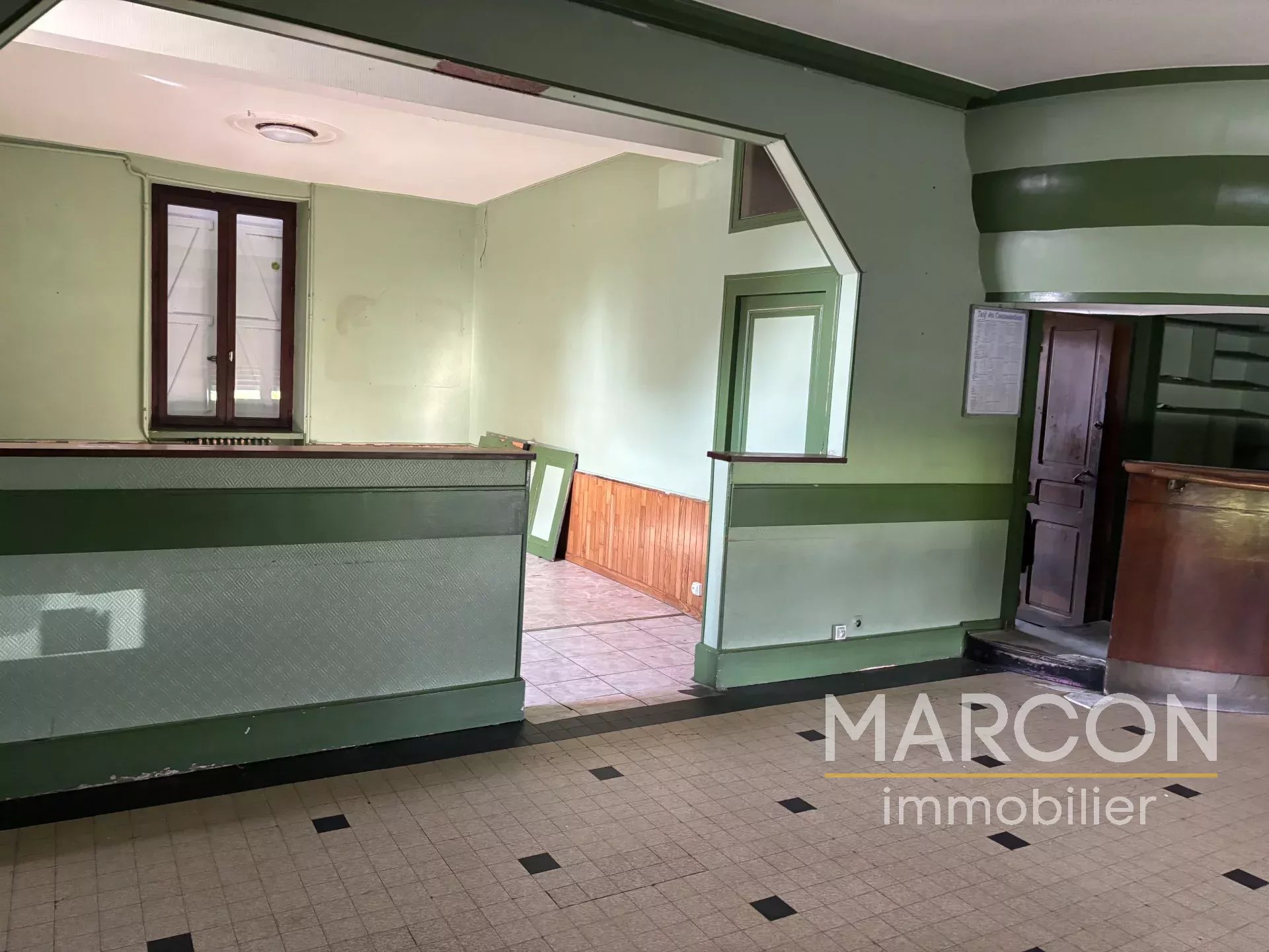 Un local commercial au rez-de-chaussée, de 85m², composé d'une grande pièce (bar) d'une cuisine et de toilettes.