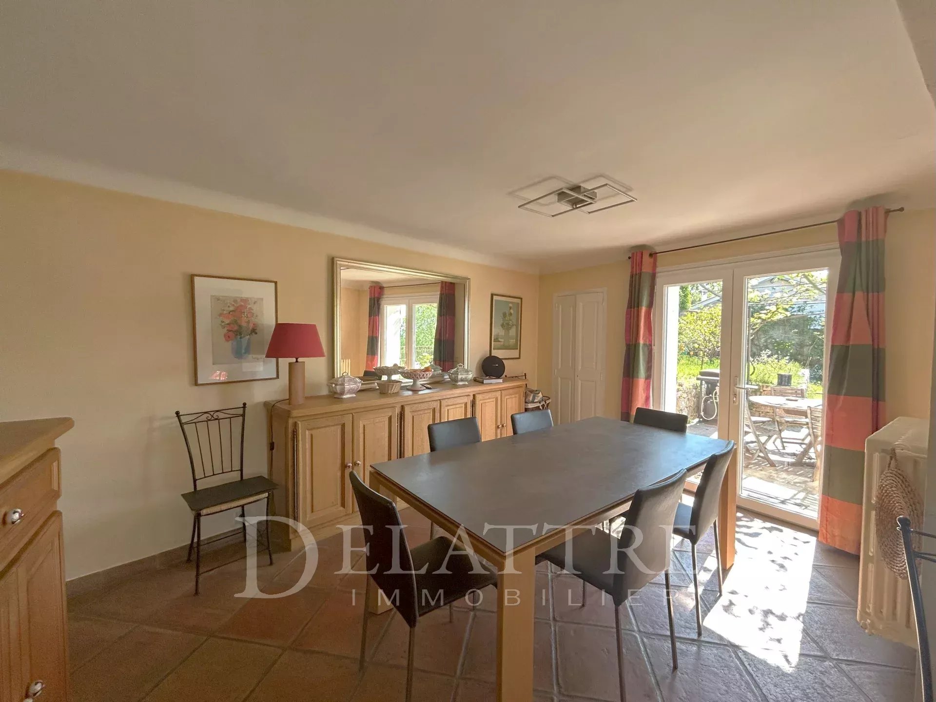 Le rez de chaussée se compose d'un grand salon et d'une salle à manger avec portes fenêtres donnant sur le jardin,d'une cuisine ouverte et d'une arriere cuisine,un beau carrelage ancien conduit à une chambre de maître de plain-pied avec son bureau,salle d'eau,et toilettes indépendants
