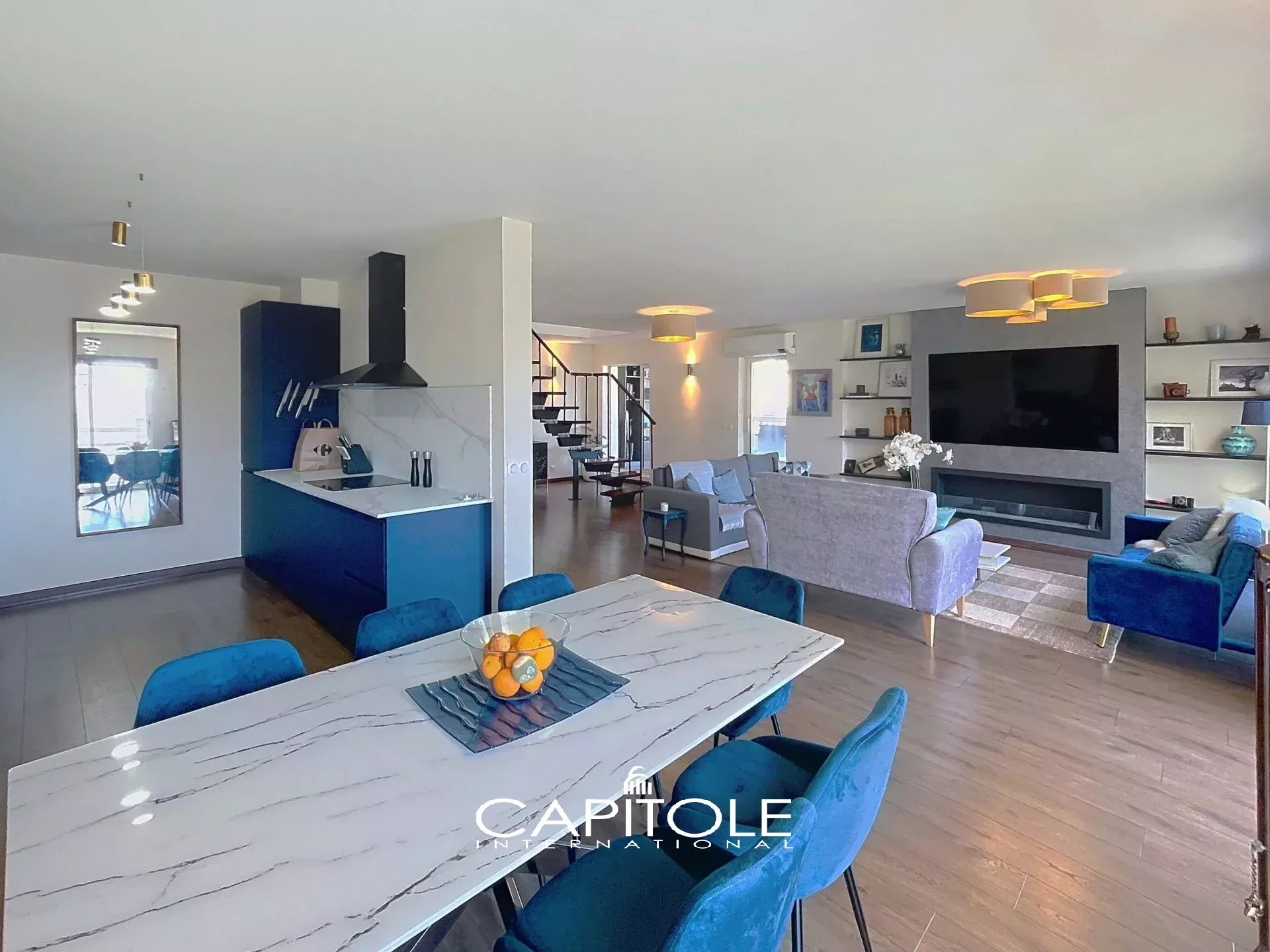 Dans une résidence de standing avec piscine, superbe penthouse duplex de 192 m² (157,58 m² Loi Carrez) entièrement rénové avec des prestations haut de gamme. Il offre de vastes espaces lumineux prolongés par deux grandes terrasses totalisant 140 m² avec vue imprenable sur la mer et les collines.