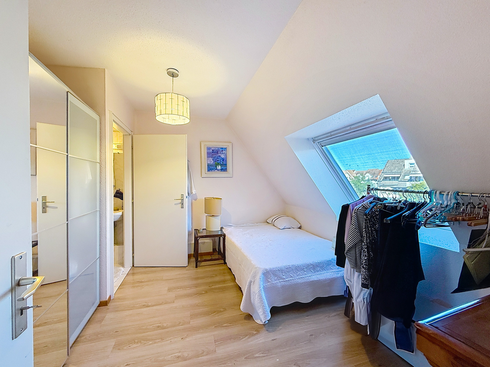 Spacieux et lumineux, il comprend une entrée, un débarras, un beau salon-séjour avec accès terrasse de 24 m2 avec stores et vue dégagée exposée SUD/OUEST, une cuisine équipée indépendante et un WC séparé.