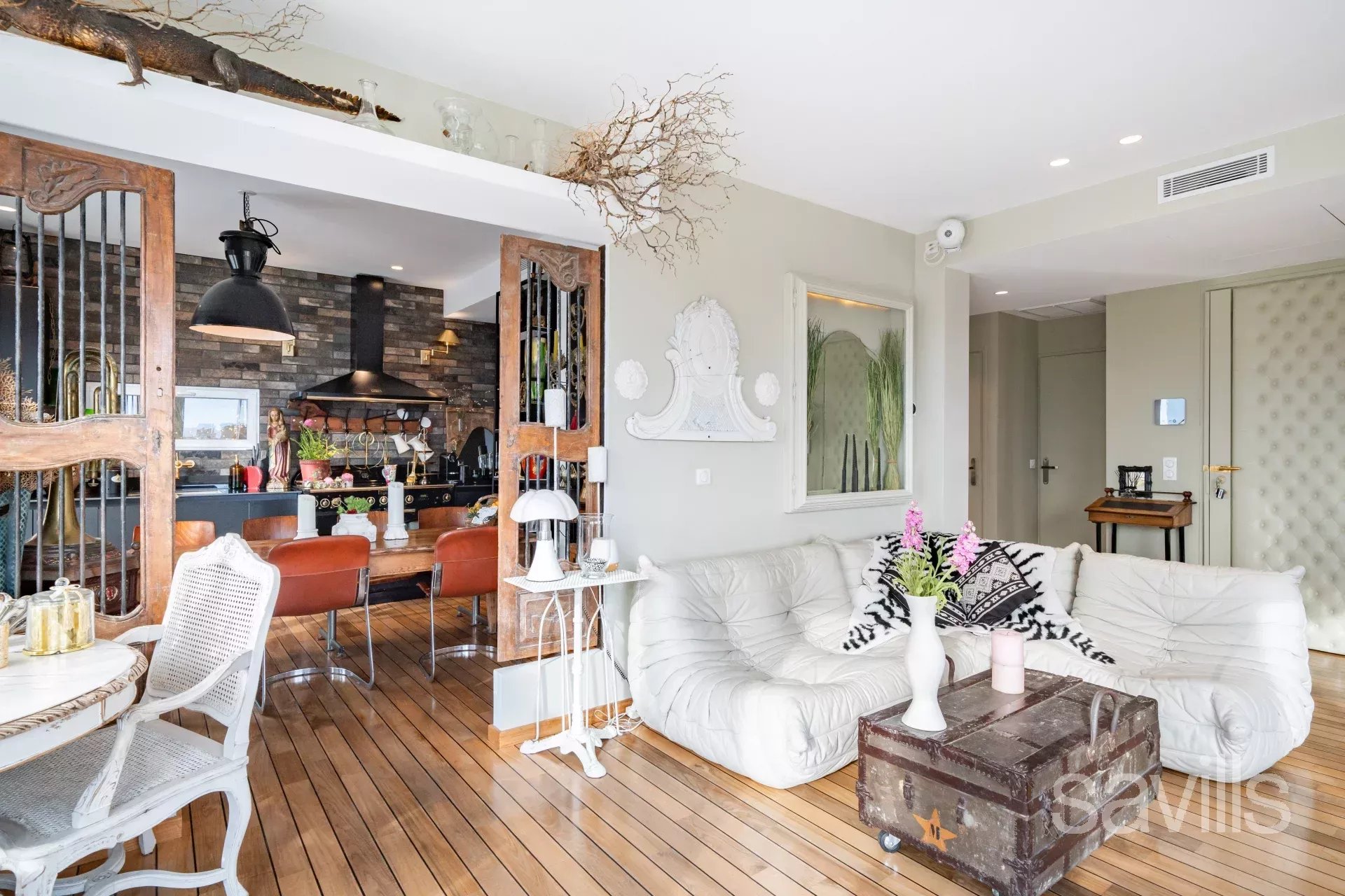 Cet étonnant lieu de vie a été conçu et réalisé par une designer visant à recréer le concept d’un navire transparent avec ses grandes baies vitrées. Une grande terrasse appelle également à une proue de navire dominante. Des matériaux nobles ont été utilisés pour cette rénovation de qualité privilégiant les volumes, la circulation, la modularité des espaces, la convivialité avec un parquet massif de pont de bateau.