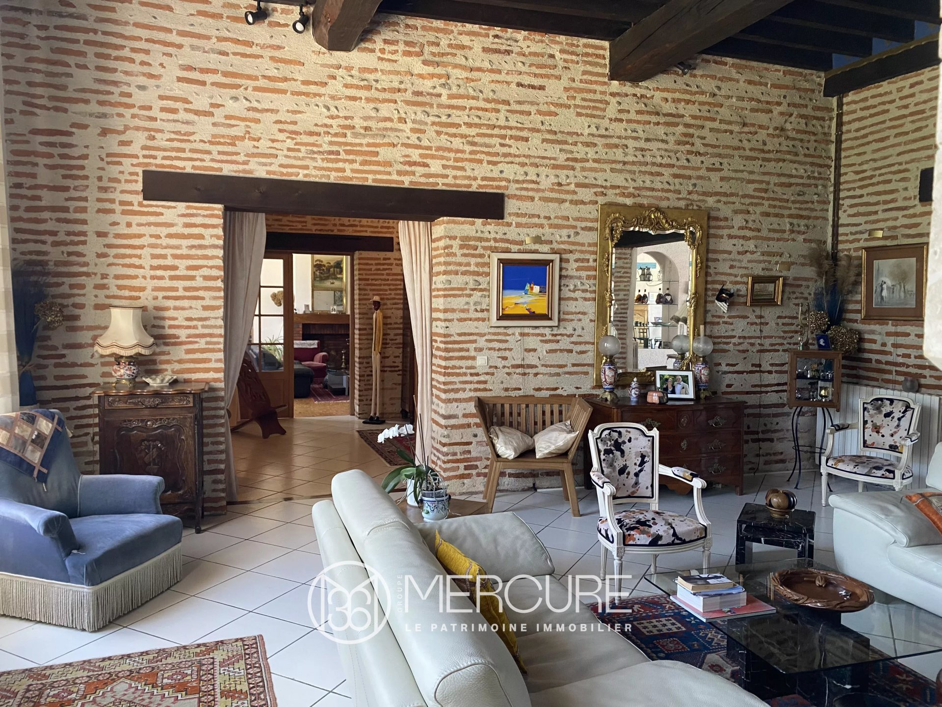 Proche de la Garonne, belle maison d'habitation de 350 m2 (dont 250 m2 pour l'habitation) avec pigeonnier, piscine, sur un terrain clos de 5 249 m2 arboré (arbres ornementaux et arbres fruitiers) et puits. Portail électrique. Construction en pierre et briques, architecture traditionnelle du Lot-et-Garonne. Au rez-de-chaussée, une entrée, 2 salons, salle à manger, cuisine ouverte, bureau, 3 chambres, grande salle de bains, toilettes, atelier, garage, local technique. A l'étage, 2 chambres, salle d'eau et combles aménageables (aujourd'hui inaccessibles).