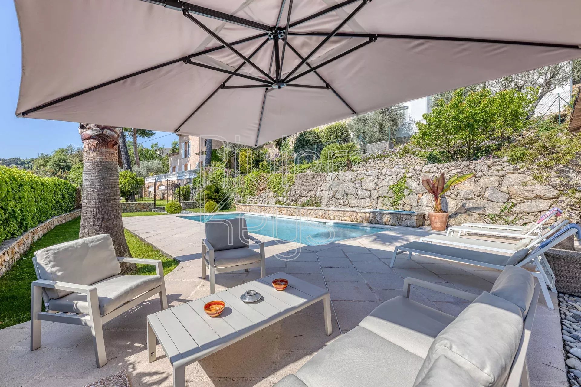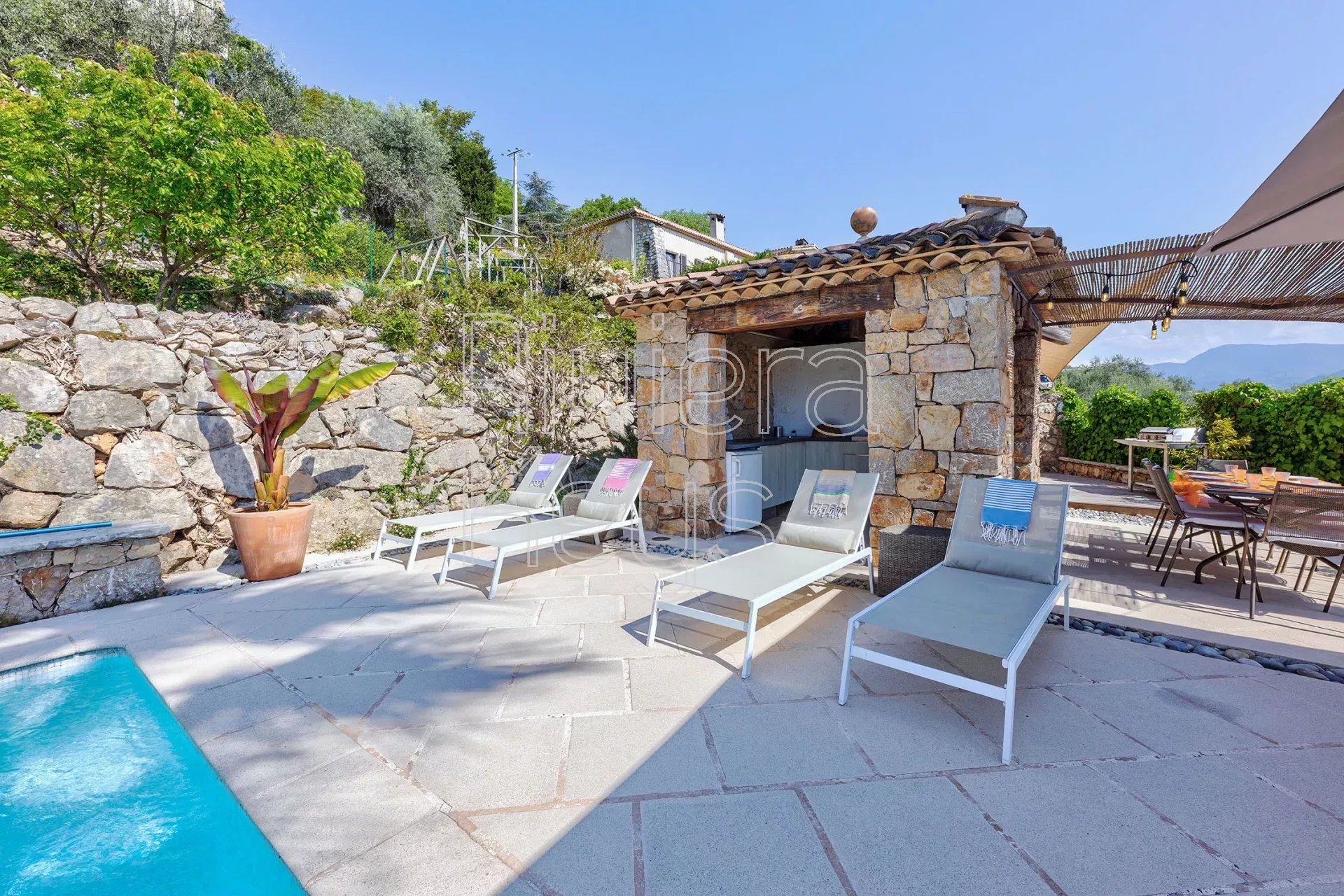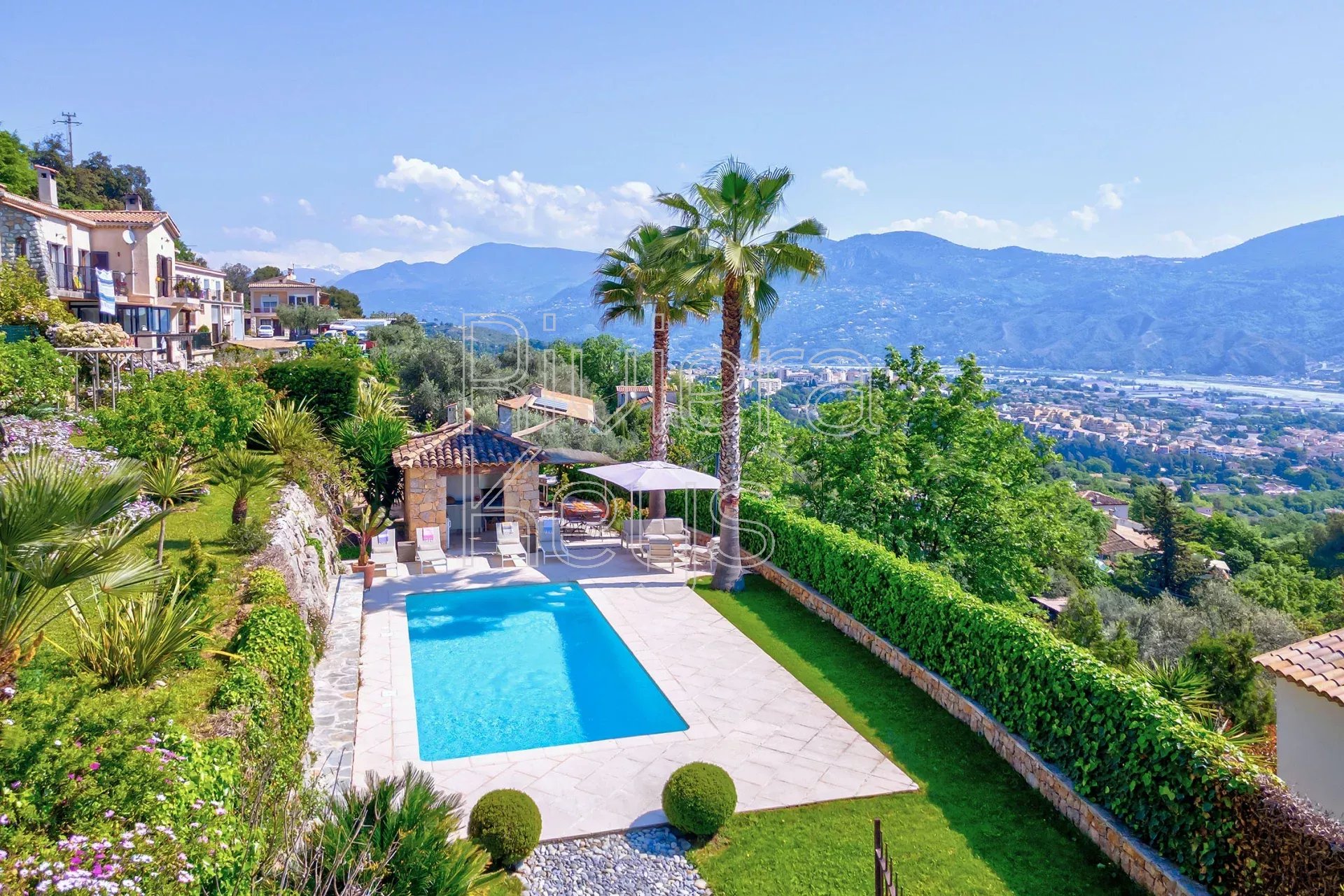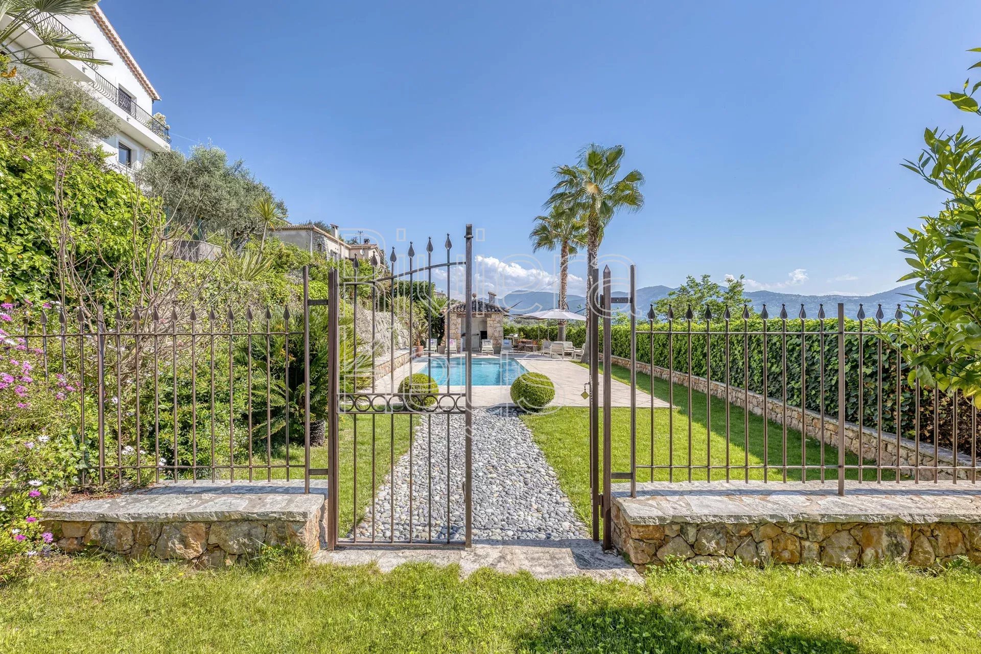 À seulement 17 km de Nice et à proximité immédiate du charmant village de Gattières, cette villa entièrement rénovée avec goût séduit par son élégance et son atmosphère paisible. Implantée sur un magnifique jardin paysager de 1 560 m² planté de cyprès, oliviers, citronnier, abricotier, grenadier, orangers et de massifs fleuris, elle offre un cadre de vie idyllique.