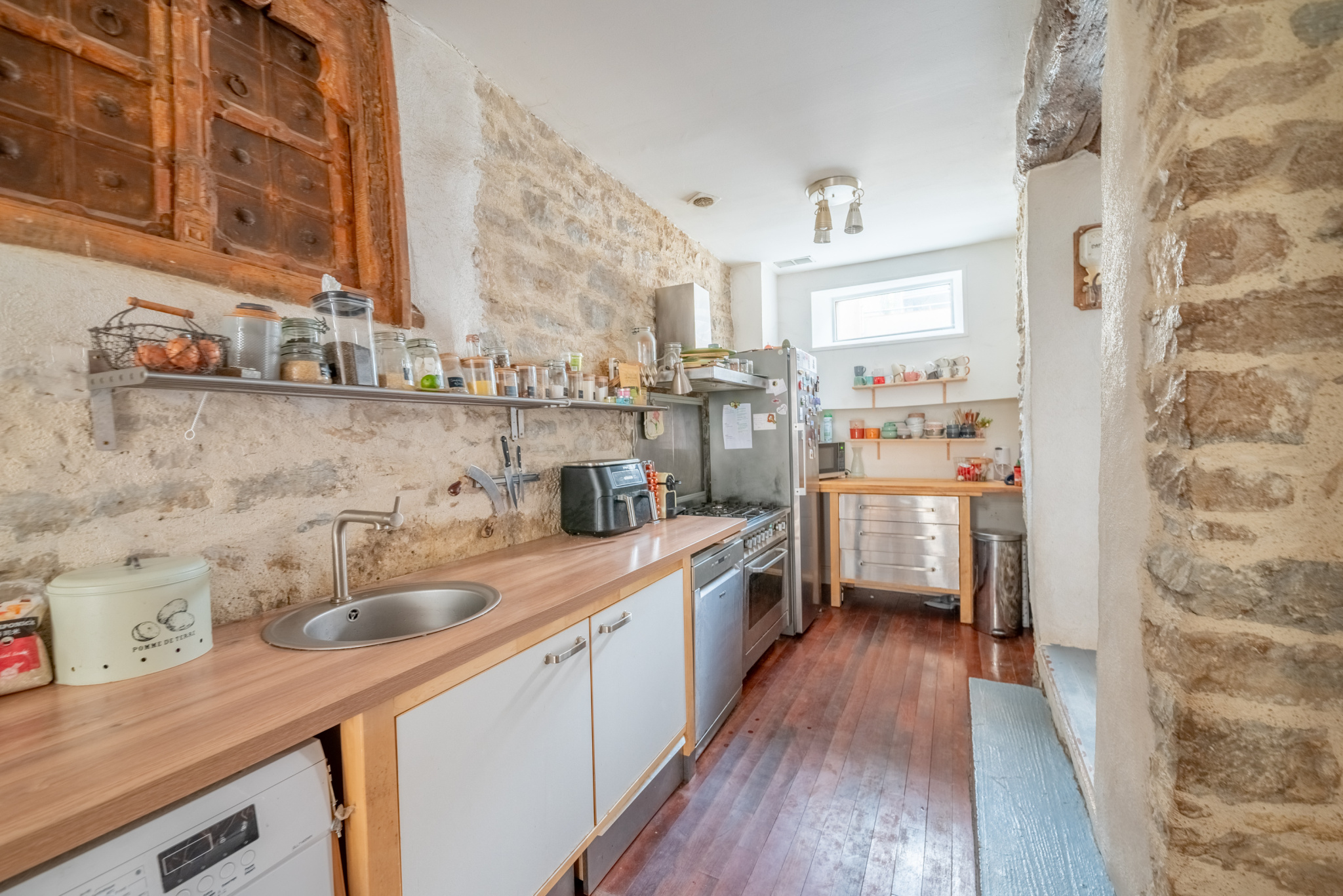 L'espace cuisine ouvert mais bien délimité permet de cuisiner tout en conservant une intimité. Le salon cosy avec son poêle à pellets pour l'hiver et son petit balcon pour le café.