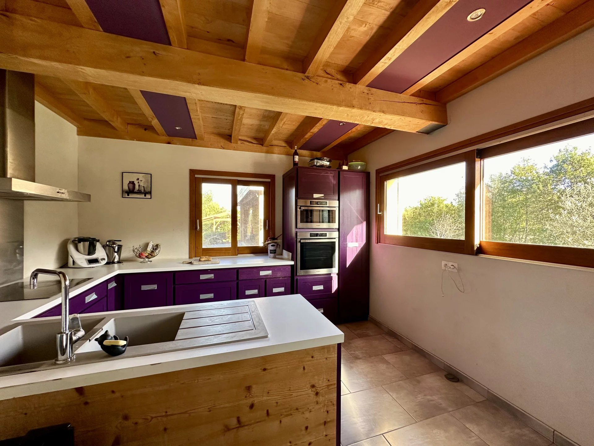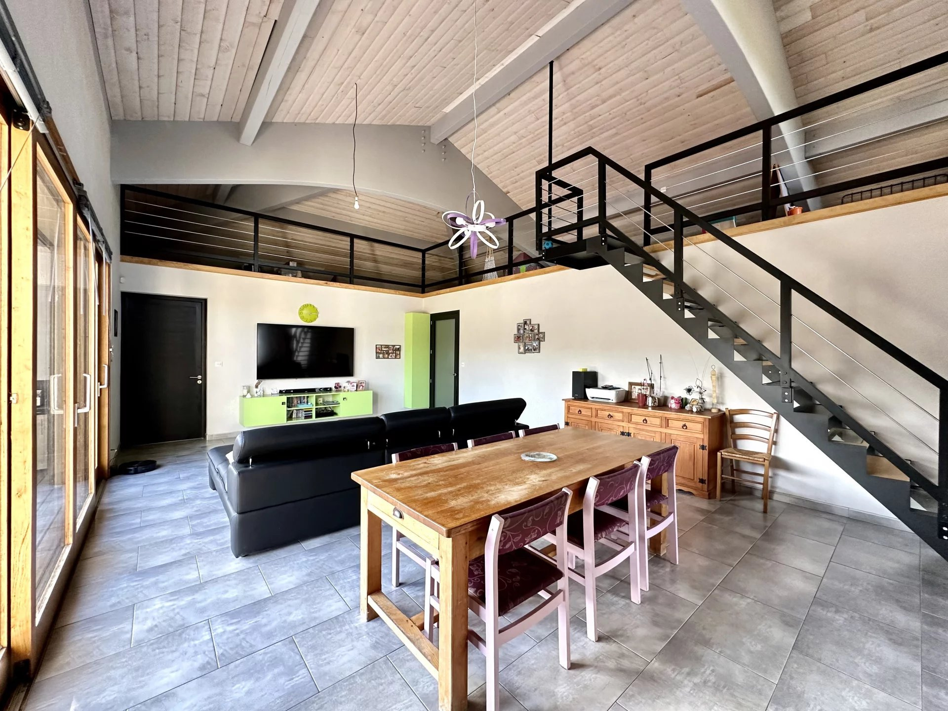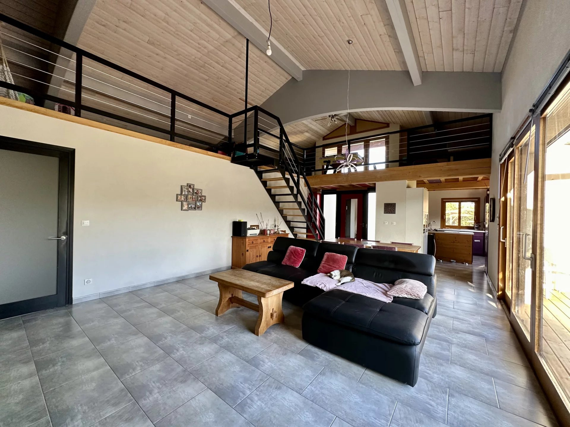 Dans un environnement champêtre entre Gimont et Mauvezin, venez découvrir cette maison contemporaine de 2010 de type 6 de 198m2 environ (260m2 au sol) sur une parcelle arborée de près de 4000m2 avec piscine, pool-house et carport. Les prestations sont de grande qualité : brique monomur, isolation en fibre de bois, fenêtres en chêne et portes en pin massif, domotique, aspiration centralisée, chauffage au sol avec PAC et chauffe-eau thermodynamique? Léntrée s?ouvre sur léspace de vie lumineux avec cuisine ouverte. Le séjour déplafonné avec léspace mezzanine qui en fait le tour offre un volume très appréciable et chaleureux avec la charpente apparente. Léspace nuit offre 3 chambres dont une avec salle déau, un cellier, une grande salle de bains, ainsi qu?une belle chambre parentale avec dressing. Côté extérieur, la piscine au sel 11x5 et son pool-house invitent à la détente et à la convivialité dans un espace préservé ! Un carport pour 3 voitures, un garage (à terminer) et un abri jardin complètent le bâti. Un bien idéal pour une famille recherchant la tranquillité !