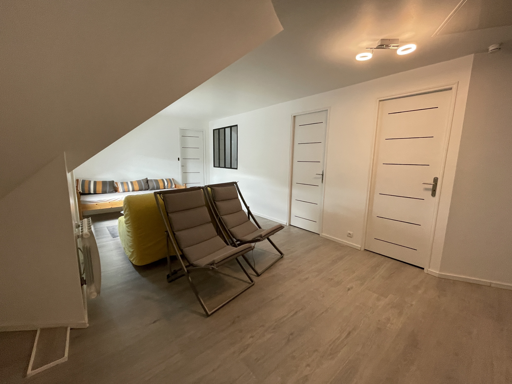 A l'étage, grande mezzanine, deux chambres, salle d'eau, WC.