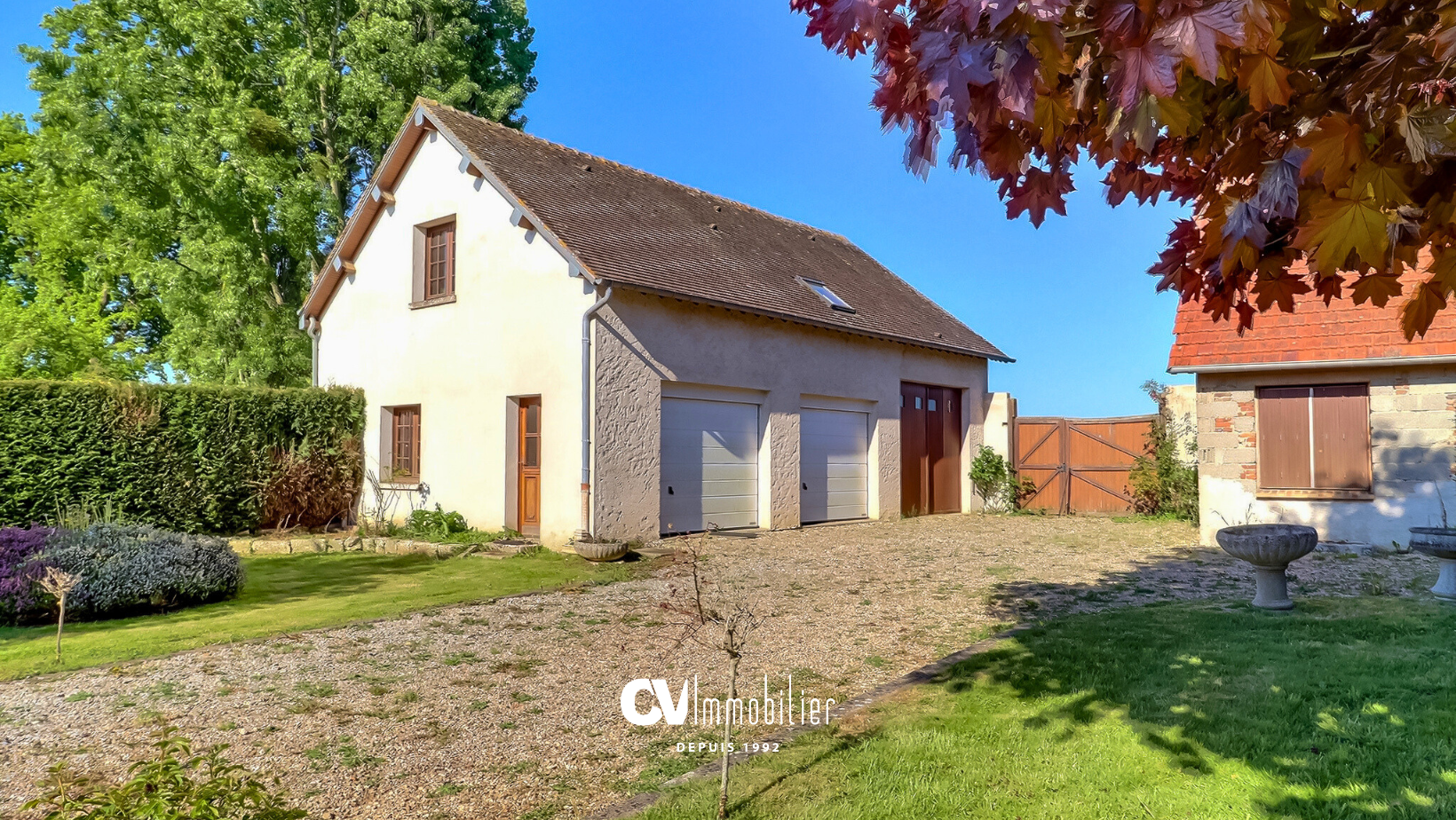 À l'extérieur : une seconde dépendance à rénover entièrement, une aire de stationnement, une terrasse, un double garage, un garage pour camping-car