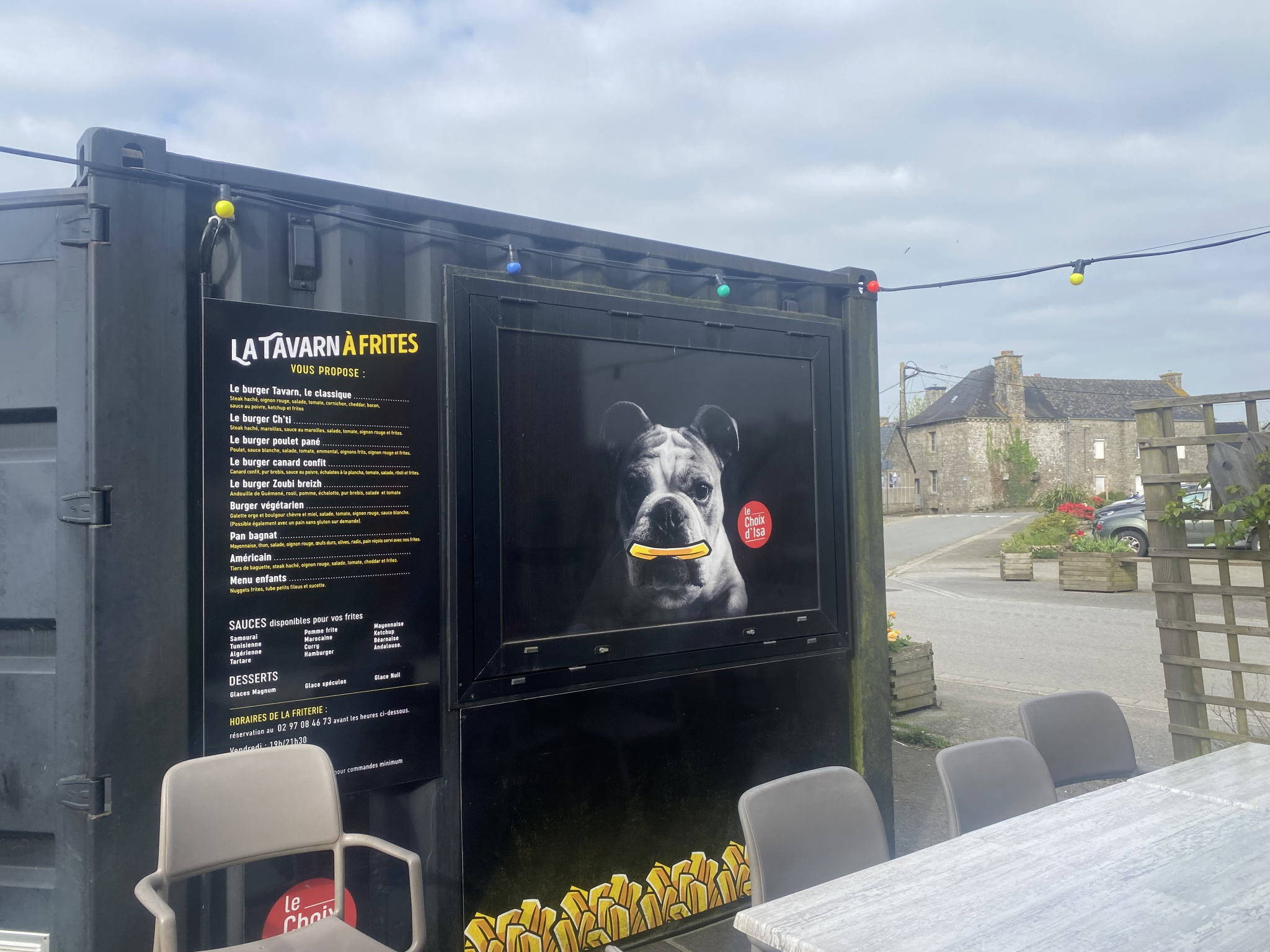 A l'extérieur : Conteneur aménagé et équipé pour de la restauration rapide sur place ou à emporter (frites, burgers maisons...)