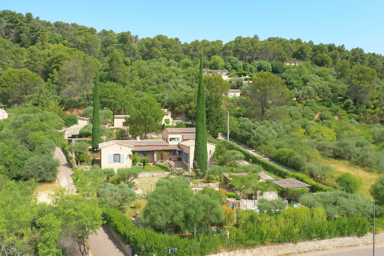 Terrain clos, piscine, forage, portail auto, garage fermé, climatisation réversible.