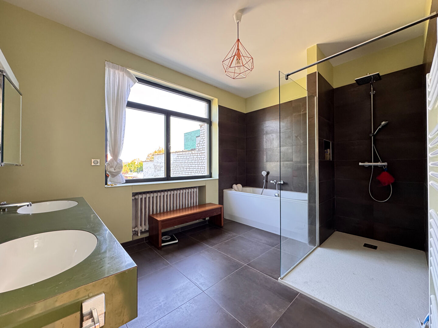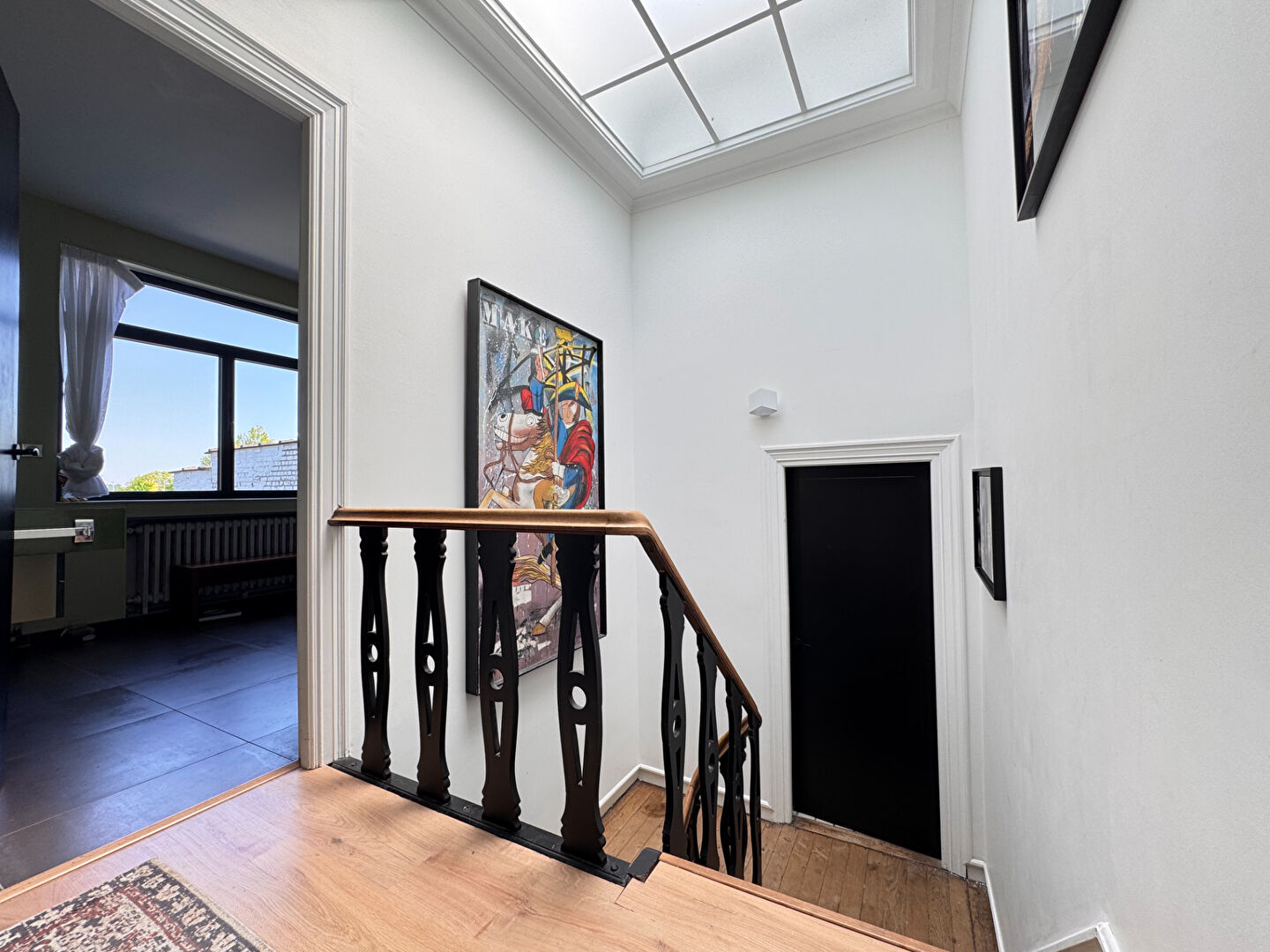 A l'étage par un majestueux escalier en chêne. Un palier éclairé par SkyDome dessert, trois chambres spacieuse de près de 20 m² (dont deux avec mur de placards intégrés),un bureau ainsi qu'une salle de bain et douche.