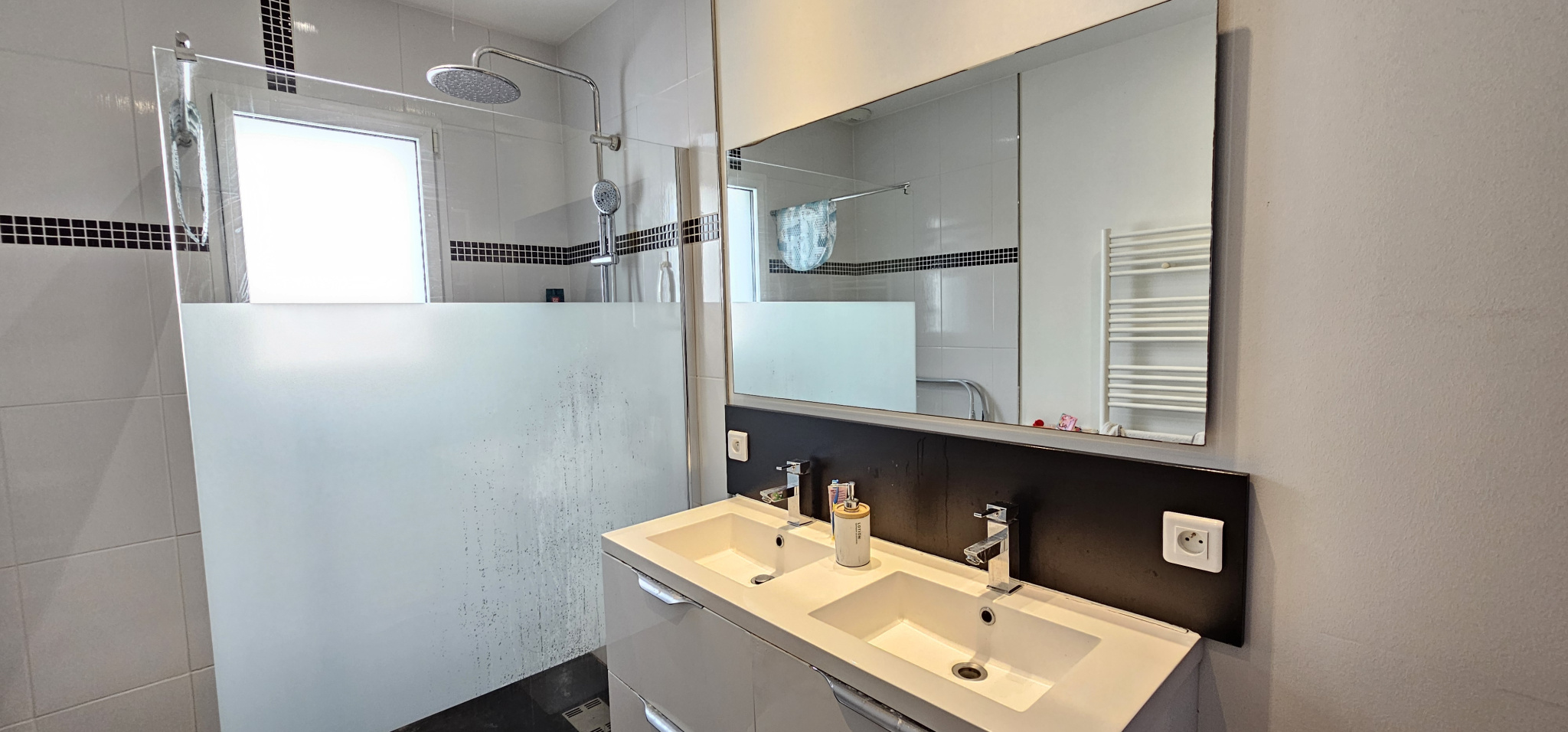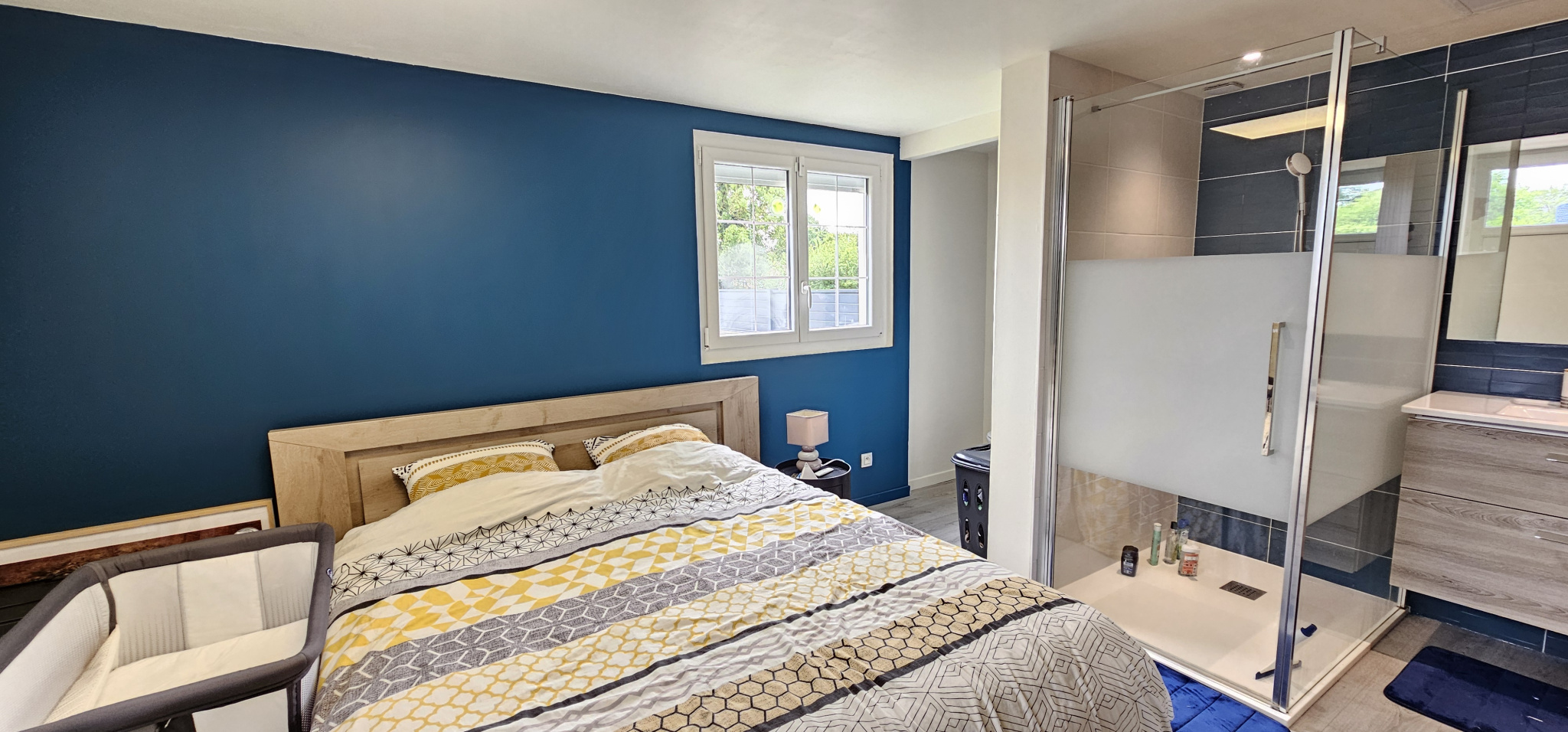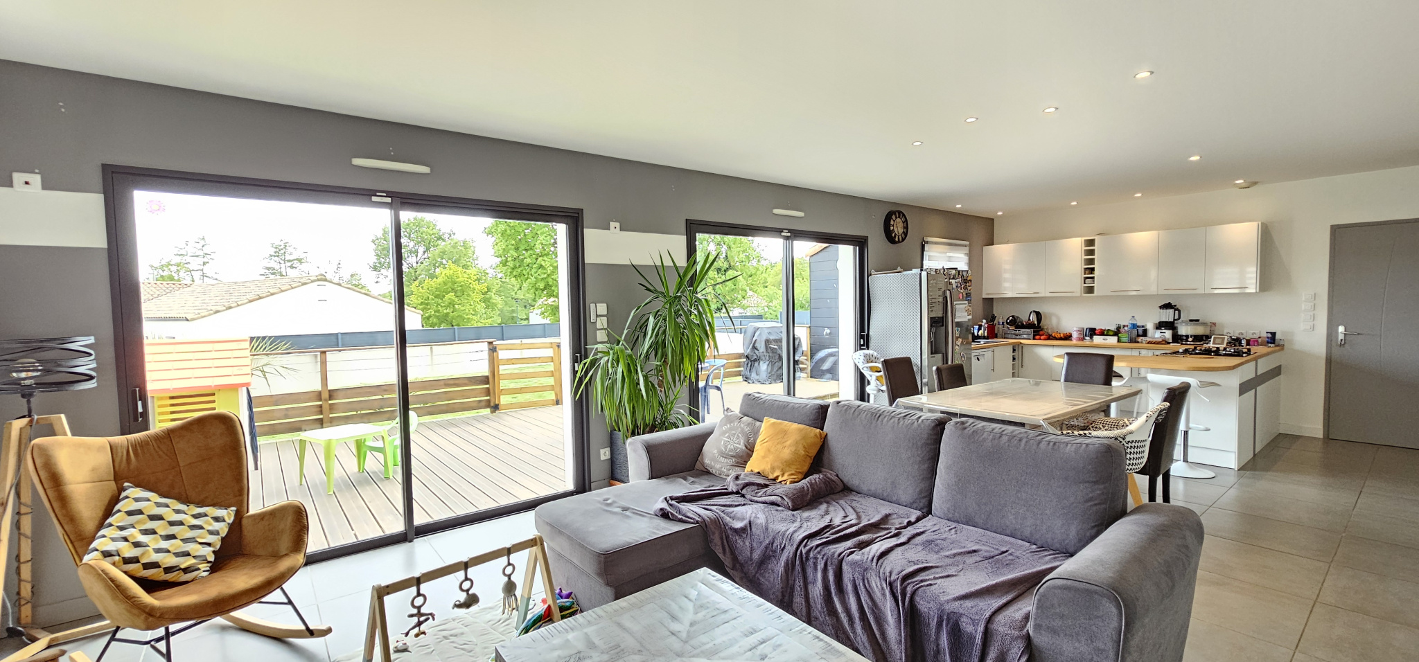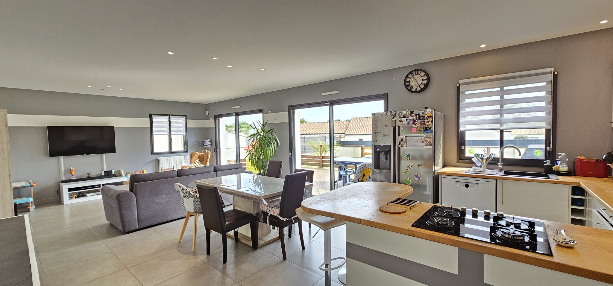 Ce plain-pied de 2015 est composé d'une belle pièce de vie (salon-séjour-cuisine aménagée et équipée), cellier. Une première partie nuit comprend 2 chambres dont une avec dressing (14.85 m2 et 11.94 m2), salle d'eau, WC. Une troisième chambre de plus de 15 m2 donnant sur le jardin avec salle d'eau et WC.