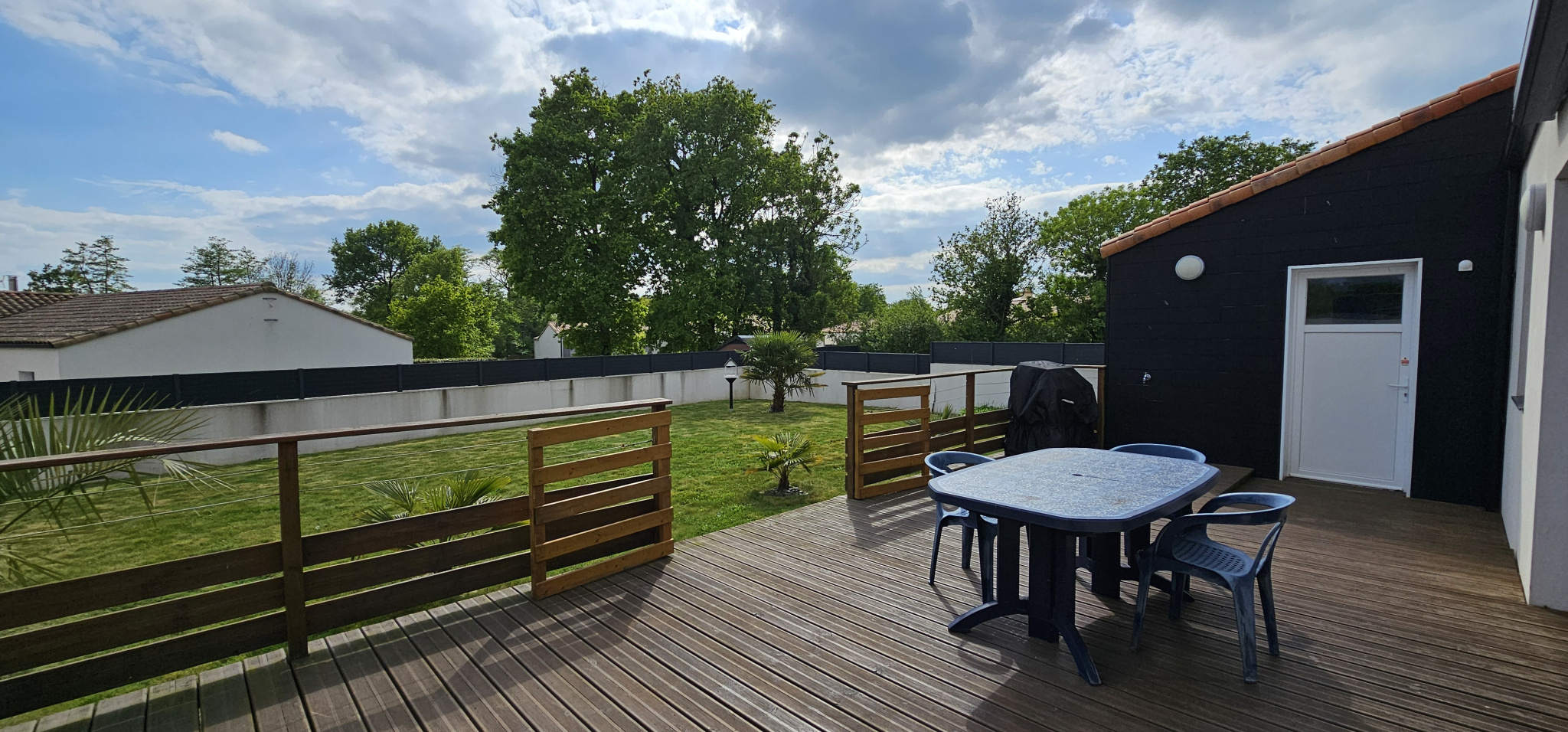 Jardin entièrement clos avec terrasse bois exposée SUD et store banne électrique. Garage avec faux grenier.