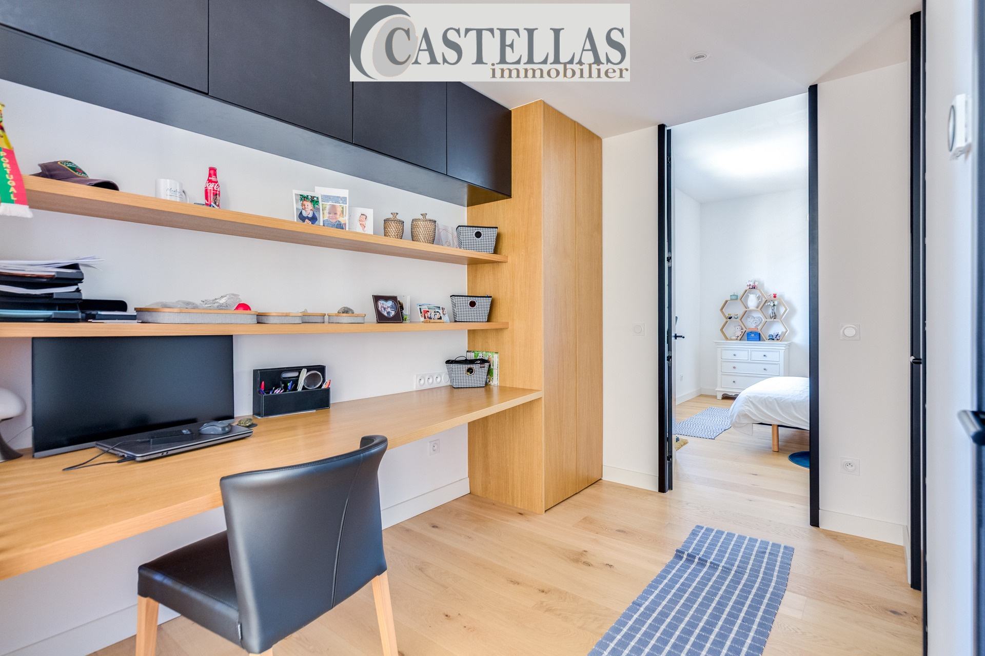 A l'étage supérieur, un bureau lumineux donnant sur un solarium de 22m2 vue mer et offre un point de vue unique sur la baie.