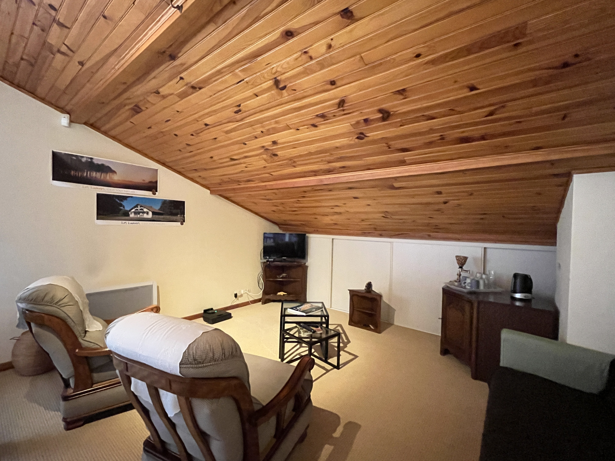 A l'étage vous trouverez un salon-détente avec billard, deux chambres reliées entre-elles par une salle d'eau avec WC et une troisième chambre avec salle d'eau et WC privatif.