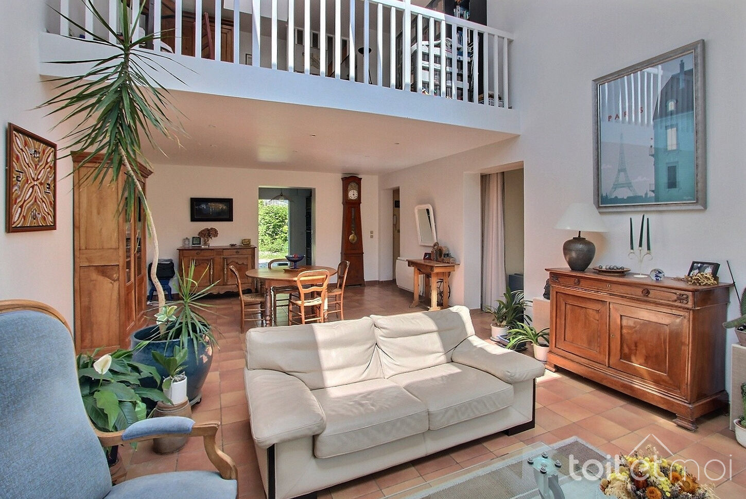 Elle comprend au rez-de-chaussée un séjour cathédrale très lumineux, une cuisine aménagée ouverte sur le séjour, un salon avec cheminée, une chambre, une salle d'eau, et des toilettes indépendants.