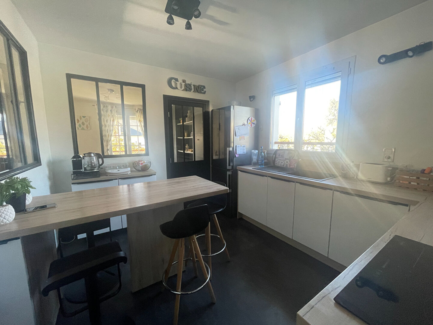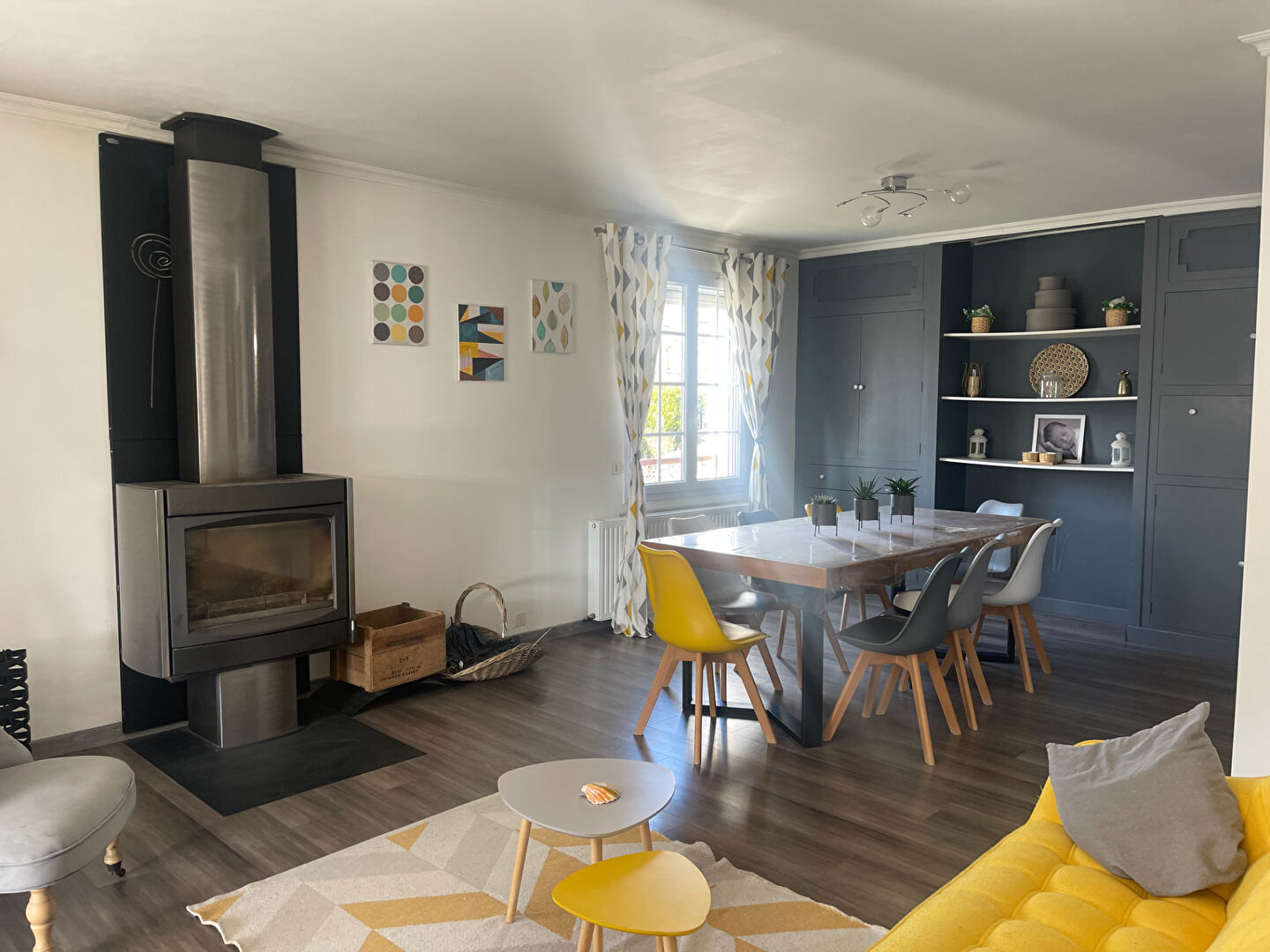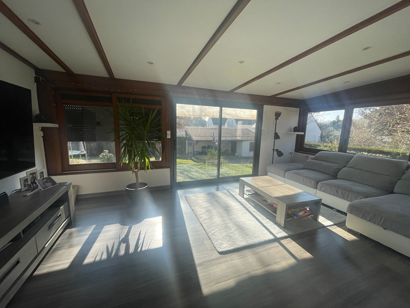Le séjour plein sud est baigné de lumière toute la journée, parfait pour les moments en famille, les apéros d'été ou les dimanches cosy.
