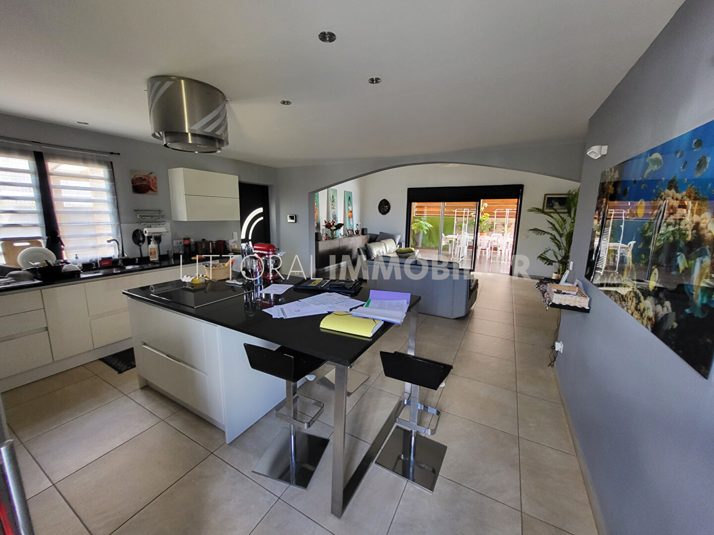 Cette maison, offrant de beaux espaces de vie, se compose au rez-de-chaussée d'une cuisine américaine entièrement équipée, ouverte sur un vaste salon/salle à manger d'environ 50 m², donnant sur une grande terrasse.