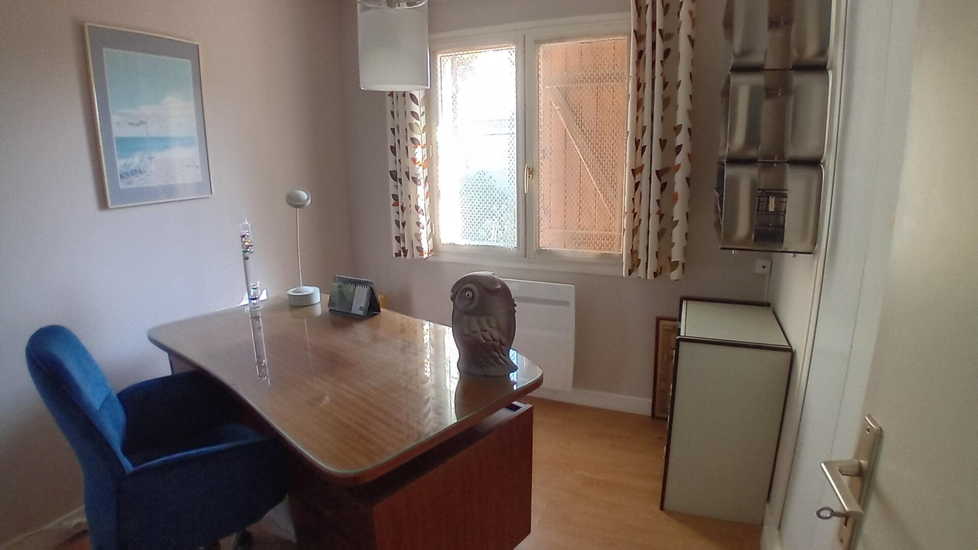 entrée avec placard, séjour donnant sur une véranda, cuisine, deux chambres, bureau, salle de bains, buanderie, WC, une pièce supplémentaire avec cabinet de toilette.