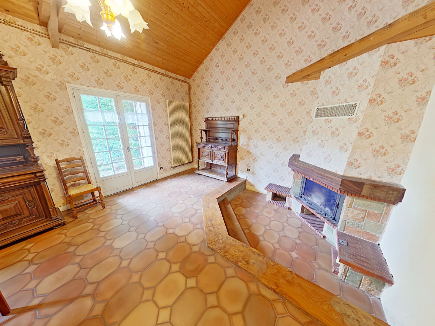 Vous retrouverez une entrée, un salon avec cheminée ancienne, une pièce de vie avec hauteur cathédrale ouverte sur la cuisine, une arrière cuisine, une chambre avec salle de bains et un toilette.