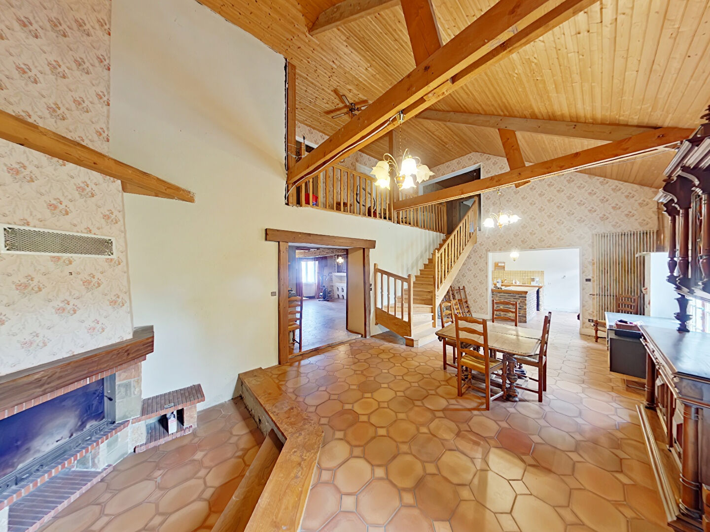 A l'étage, une mezzanine desservant trois chambres, un second toilette, une salle d'eau, et une pièce de 55m² pour laisser place à son imagination, des combles également aménagés en partie.