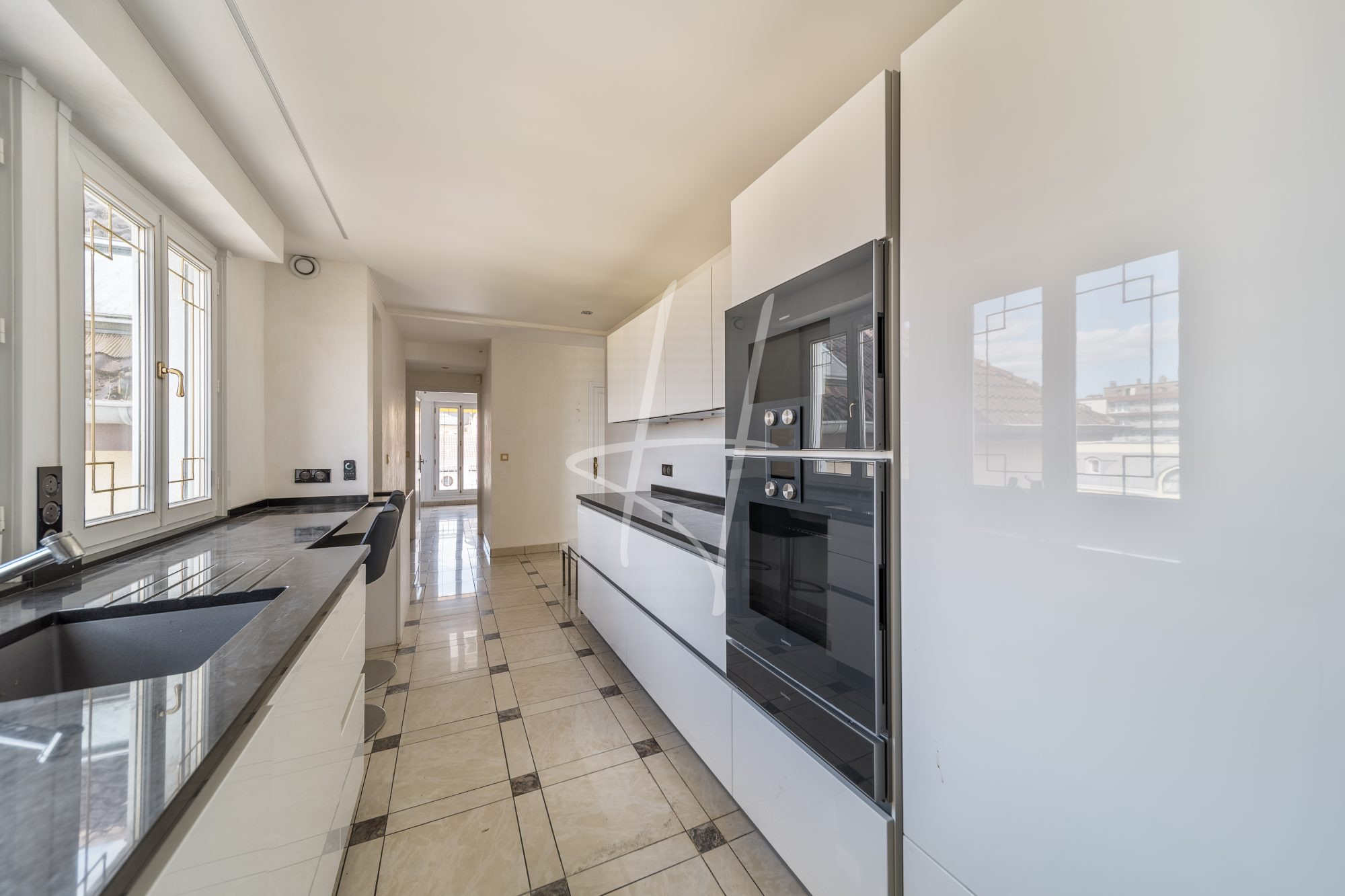 Au 4? et dernier étage avec ascenseur, T5 traversant de 112,91 m² avec 3 terrasses, salon lumineux, cuisine équipée, 2 chambres + bureau, salle de bains rénovée, box en sous-sol. Vue sur Mont Saint-Quentin, DPE D/B, bus & commerces à pied.