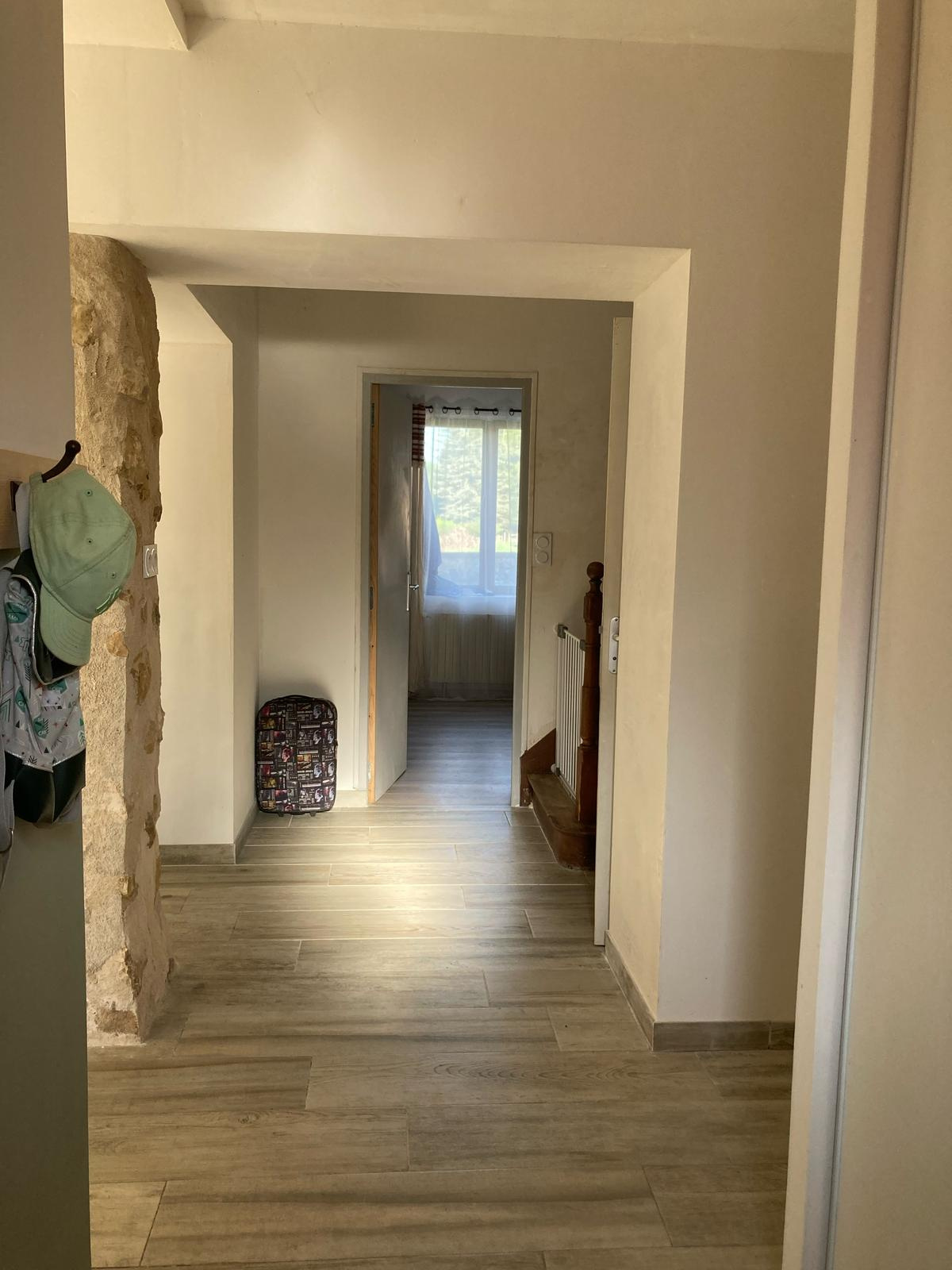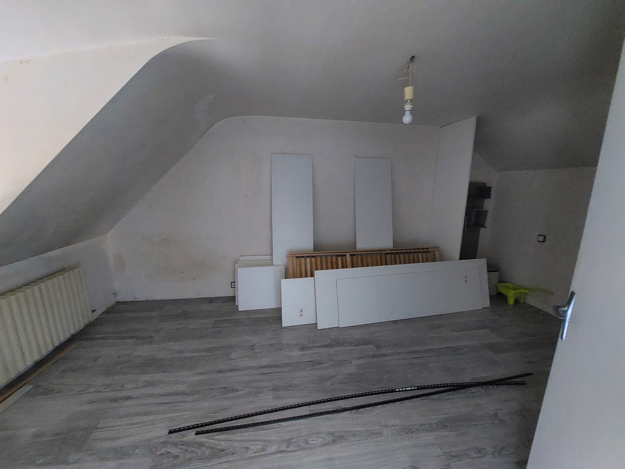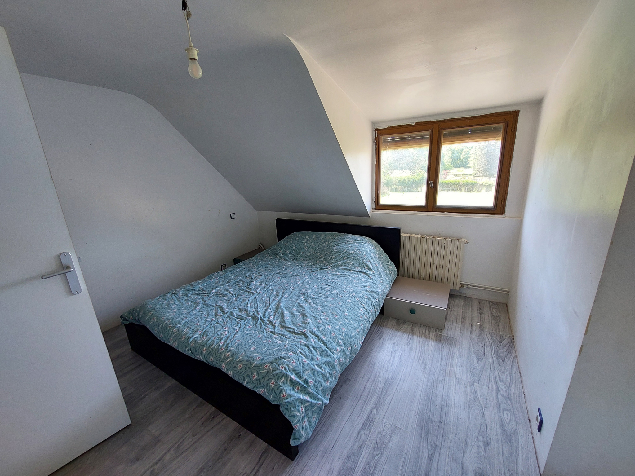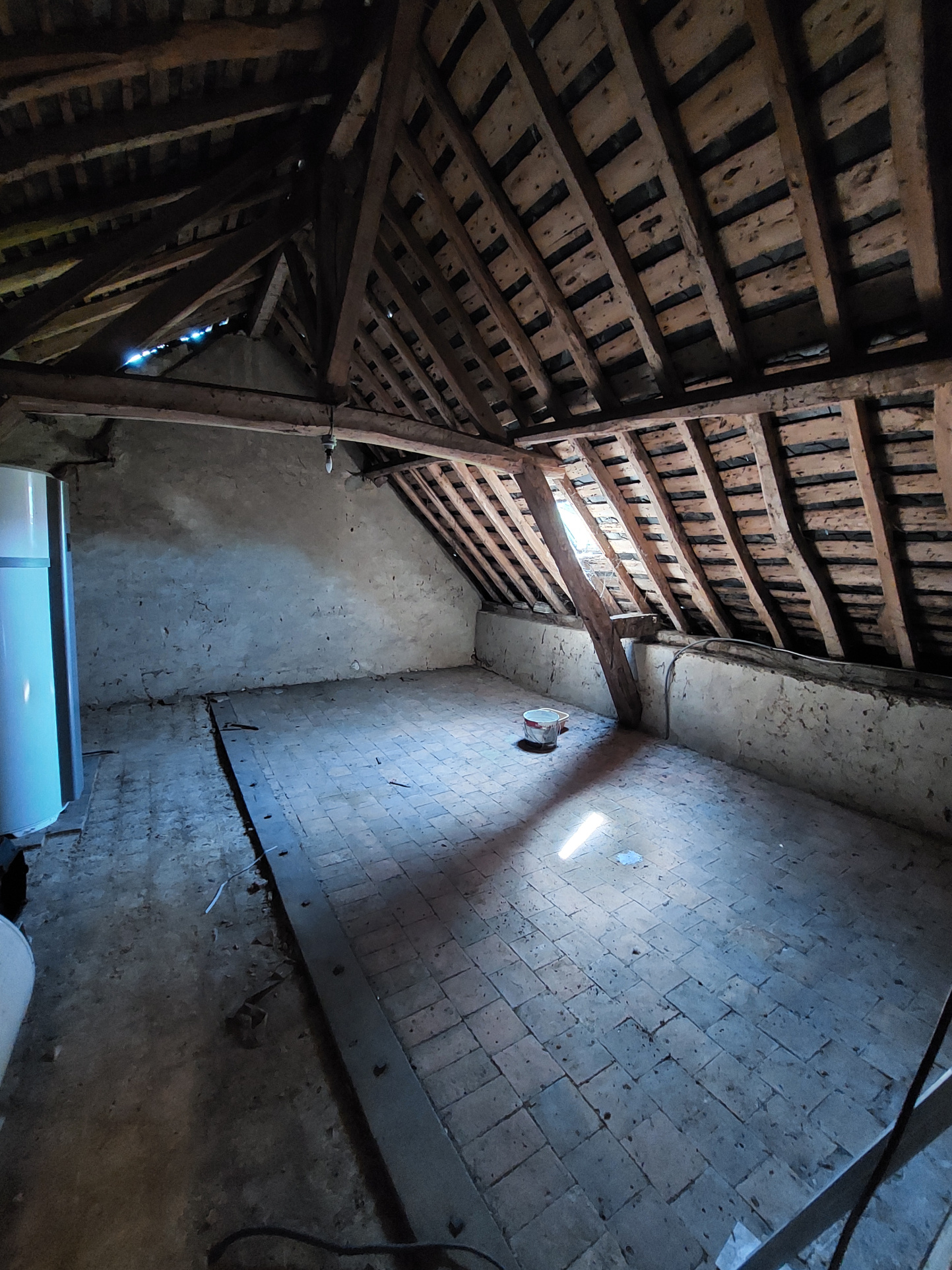 Maison mitoyenne d'un coté comprenant : entrée avec placards, cuisine aménagée et équipée donnant sur pièce de vie avec poêle à bois, lingerie, WC, SDB avec douche et baignoire ainsi que 2 chambres. A l'étage, un palier, 2 chambres en enfilade + un grenier aménageable.