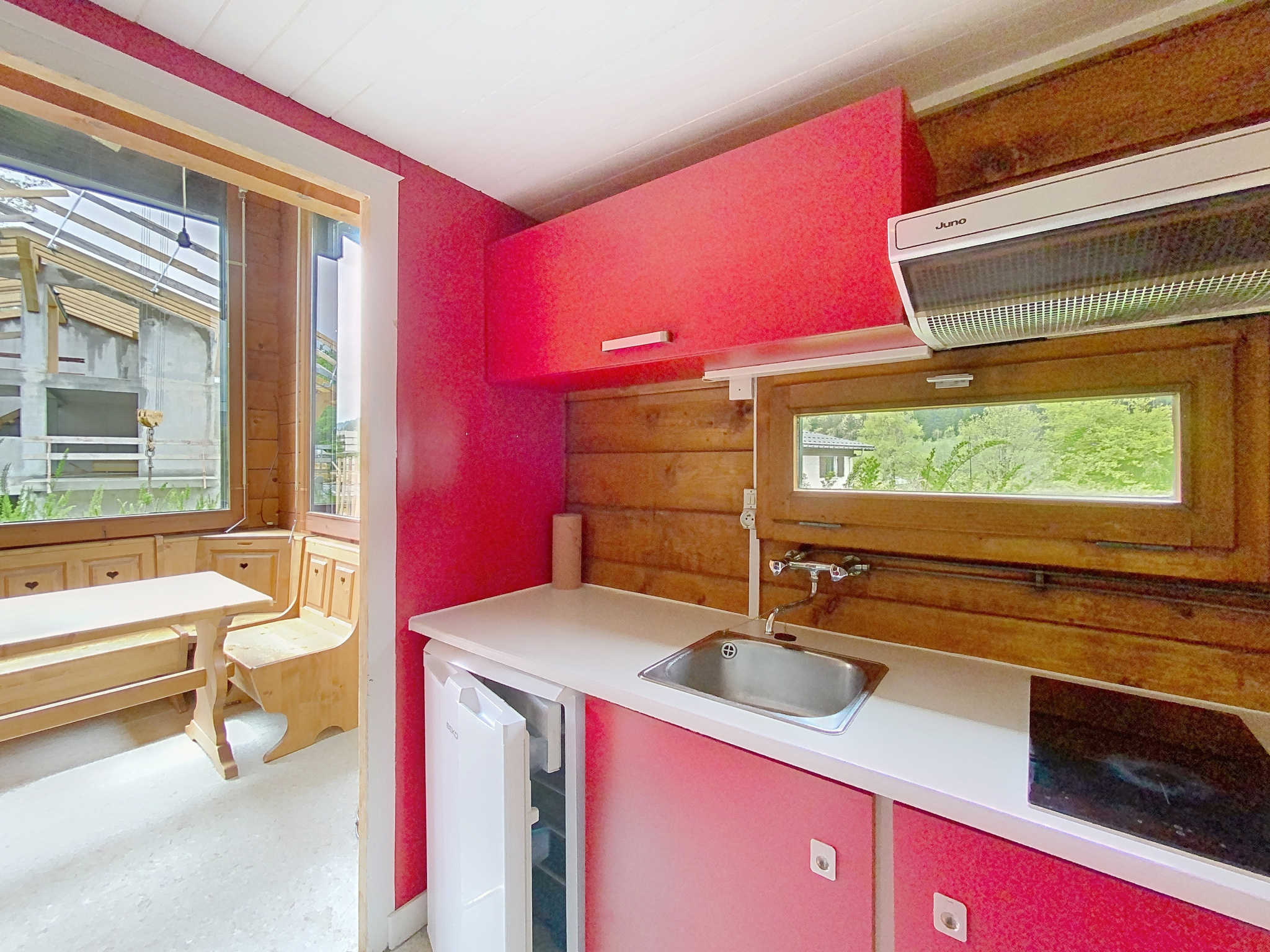 À l'intérieur, vous trouverez un espace de vie lumineux avec kitchenette ouverte, une salle d'eau avec WC, ainsi qu'un espace nuit confortable en mezzanine, à l'étage.