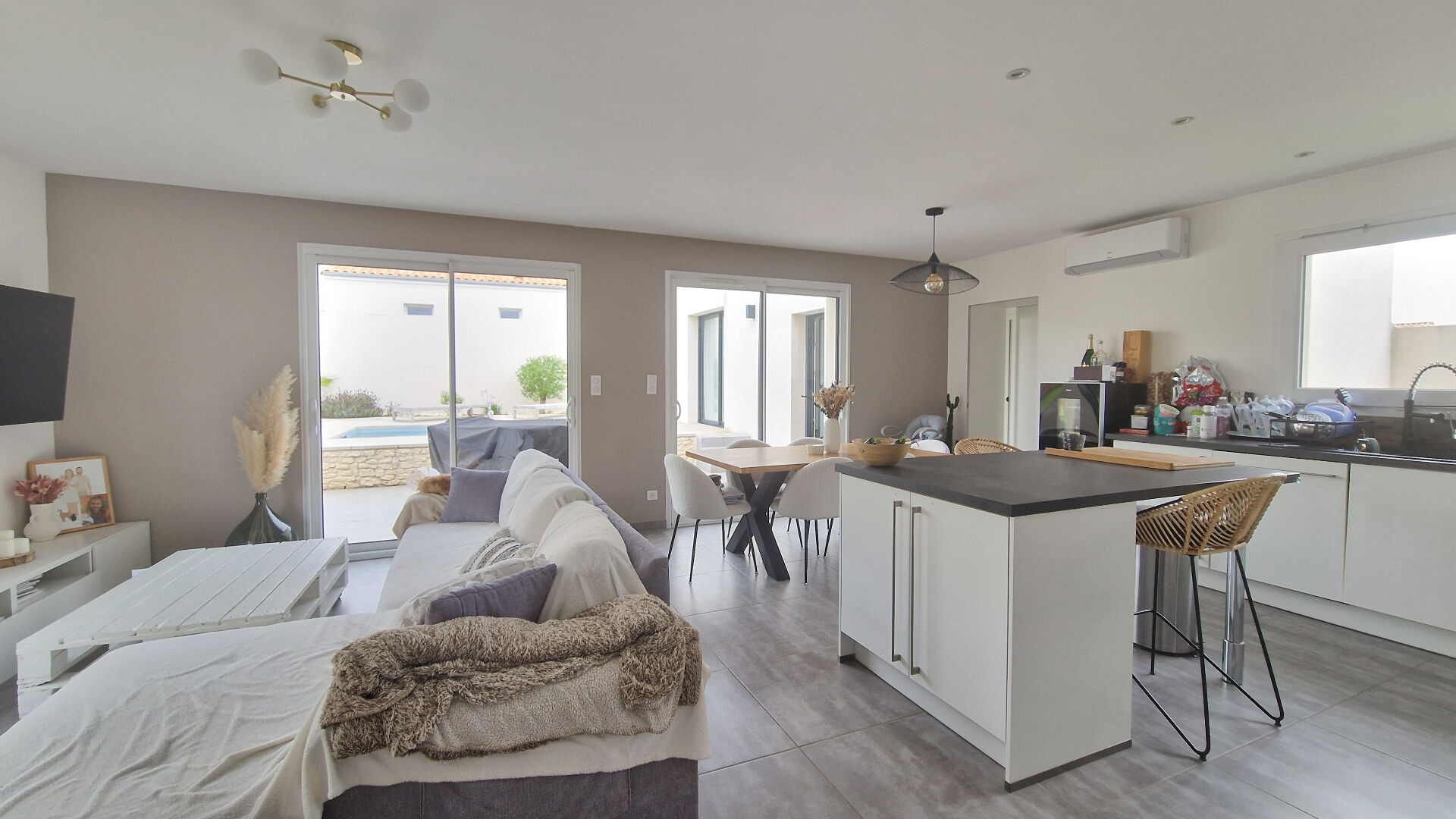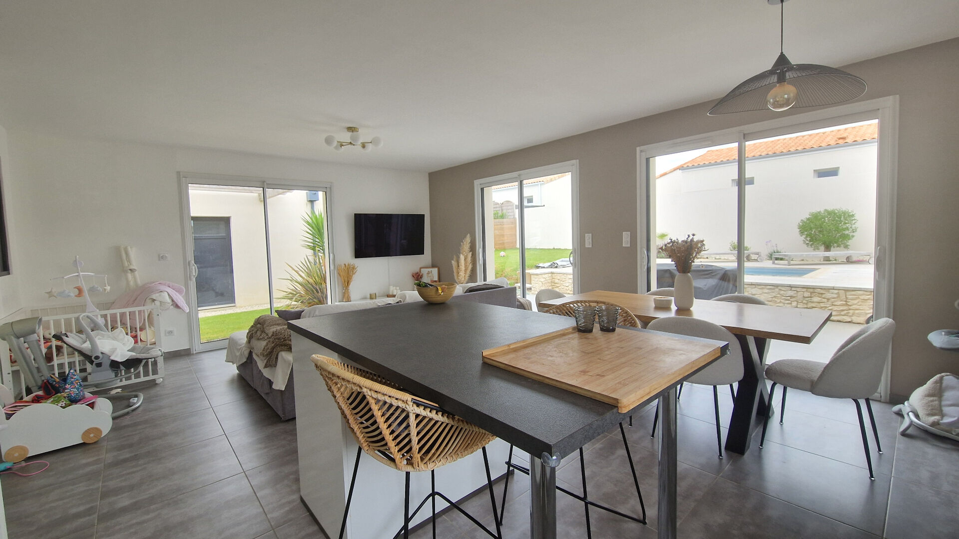 Chauray, belle maison de plain-pied contemporaine de 2016 avec extension en 2024 d'environ 123 m² très lumineuse. Elle se compose d'une entrée avec placard et verrière, une pièce de vie donnant sur le jardin avec cuisine équipée ouverte, un cellier, 4 chambres dont dont une suite parentale avec salle d'eau et wc, un dégagement avec placard, une salle de bains avec douche et baignoire un wc suspendu. Terrain clos 498 m², terrasse bois, piscine. En annexes: patio, garage indépendant.