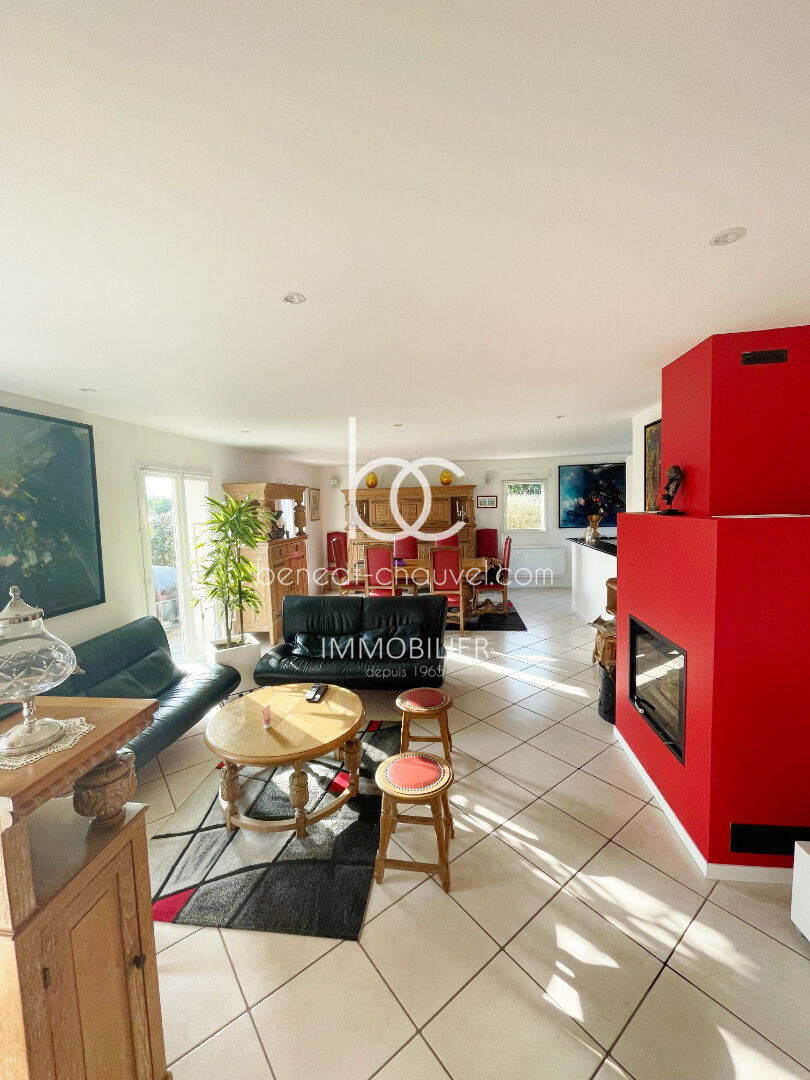 Une grande pièce de vie lumineuse avec cheminée insert, ouverte sur une terrasse Plein Sud.