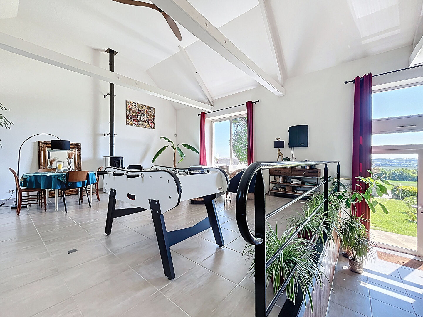 L'ancienne salle de théâtre, magistralement transformée en salle de réception avec plus de 6 mètres de hauteur sous plafond, apporte une dimension spectaculaire à l'ensemble. Elle est équipée d'un poêle à pellets pour une atmosphère chaleureuse et conviviale.