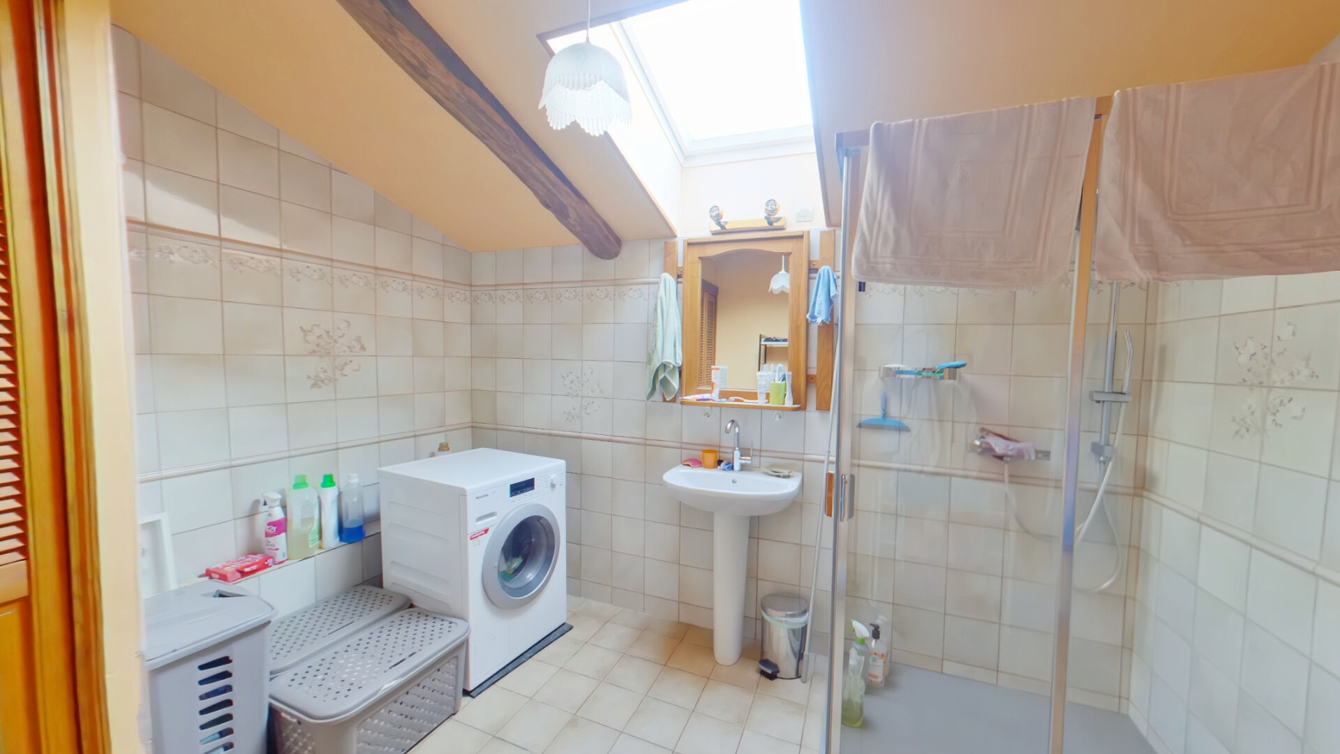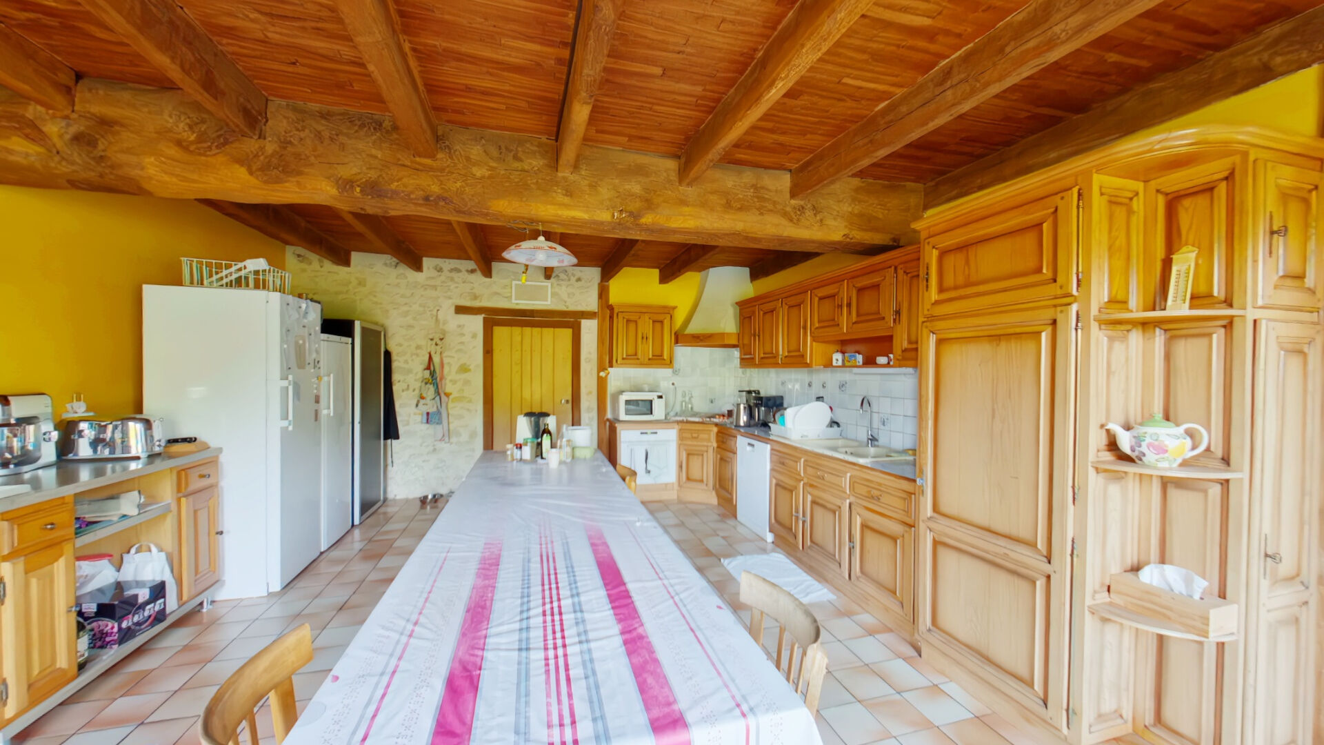 La maison allie charme et confort moderne : un vaste séjour lumineux avec cheminée et poêle à bois, une cuisine spacieuse avec cellier, une terrasse couverte offrant une vue apaisante sur l'étang. Un espace polyvalent peut servir de chambre, bureau ou salle de jeux. À l'étage, cinq grandes chambres, un bureau et la possibilité de créer des suites avec salle d'eau. Chauffage économique par chaudière haute condensation au bio fioul, sols en tomettes et parquet en chêne, toitures récemment refaites.
